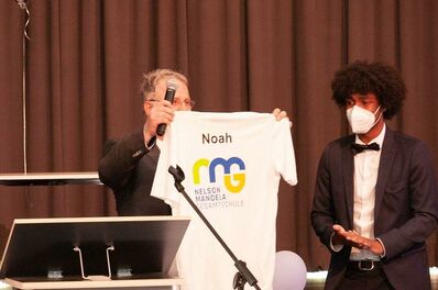 Bei hochsommerlichen Temperaturen versammelten sich die Schulgemeinde letzten Donnerstag in der festlich geschmückten Schulmensa, jeder Absolvent konnte mit jeweils zwei Angehörigen auf beschrifteten Stühlen Platz nehmen. Durch den stimmungsvollen Abend führte Tawfic Arabi, ein Abiturient aus den eigenen Reihen. Als ersten bat er Bürgermeister Dietrich Aden ans Mikrofon. Er betonte in seiner herzlichen Ansprache die besonderen Umstände ihrer Schulzeit. Alle hätten trotz Baumaßnahmen, Pandemie und reichlich Ungewissheit trotzdem das Abi geschafft, „da können Sie, könnt Ihr stolz drauf sein. Sie haben etwas geleistet in einer außergewöhnlichen Zeit.“ Schuldezernent Klaus Pläger betonte den Wert der persönlichen Begegnungen: „Sie haben hier Freunde getroffen – wenn man etwas Glück hat, sogar fürs Leben.“