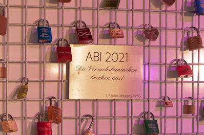 Und dann gab es endlich die Zeugnisse. Mit einer symbolträchtigen Aktion verabschiedeten sich die Schüler dann von ihrer Schule: Beim Gang auf die Bühne, wo es die Zeugnisse gab, brachten sie jeweils Schlösser mit dem eigenen Namen an einem Gitter an, das wohl einem Kaninchendraht nachgebildet ist. Ihre Schlüssel nehmen sie nun mit und bleiben so der Schule auf ewig erhalten!