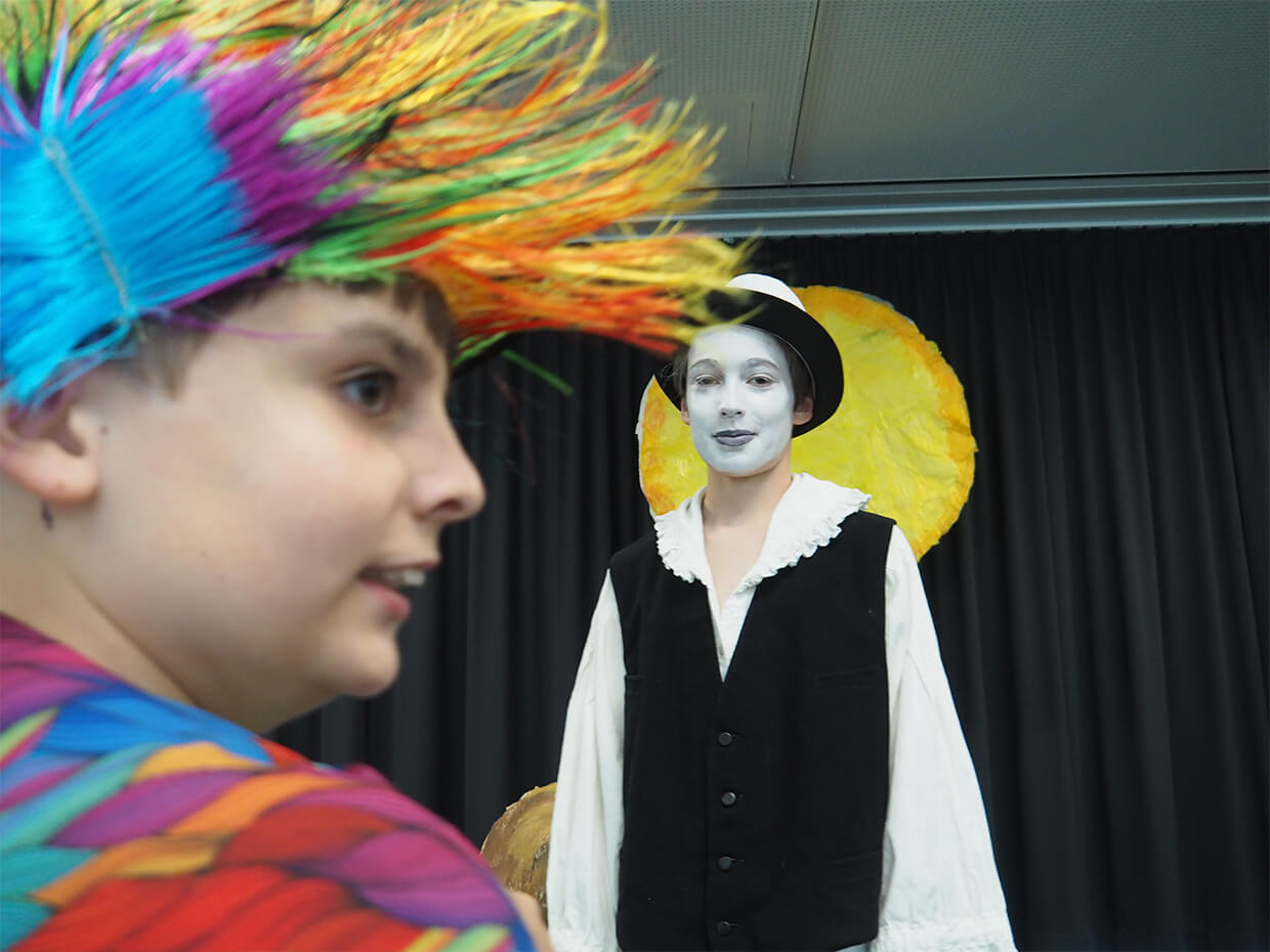Das Bühnenbild und die farbenfrohen und individuellen Kostüme (Kunst- und Klassenlehrerin Doris Möhring und Team) versetzten das Publikum in Afrika-Stimmung und hervorragende Ton- und Lichttechnik (Leitung: Julian Dawin und Team) verliehen dem afrikanischen Märchen einen besonderen Charme.