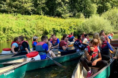 Mit alle sind nicht nur die 58 Kinder und ihre vier Klassenlehrerinnen gemeint, sondern auch die 20 Oberstufenschüler der Nelson-Mandela-Gesamtschule, die hier im Rahmen ihrer Jugendleiterausbildung praktische Erfahrungen sammeln, indem sie u.a. Gruppen und Spiele anleiten. Manche von ihnen waren vor fünf Jahren sogar selbst als Schüler schon dabei und kennen die medienfreie und zuckerarme Woche schon aus eigenem Erleben.