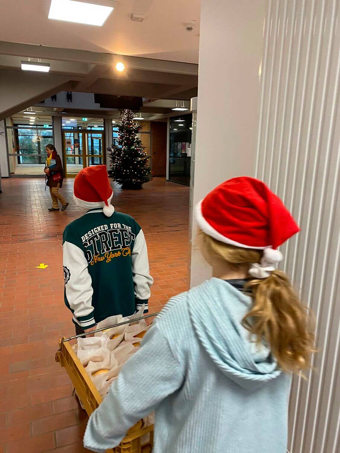 Die Schülervertretung (SV) hat mit vollen Einsatz 1200 duftende Stutenkerle organisiert und diese an die gesamte Schulgemeinschaft verteilt. Mit strahlenden Gesichtern, aber vor allem mit auffälligen Nikolausmützen auf dem Kopf, zogen sie durch die Flure und sorgten für eine vorweihnachtliche Stimmung, die man nicht übersehen konnte.