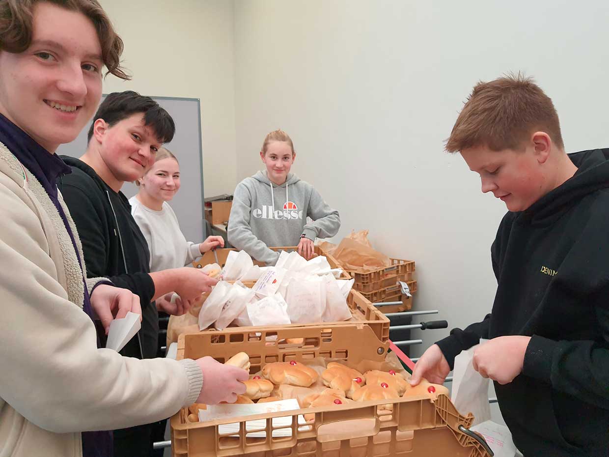 Die fleißigen Hände der SV haben in der 1.Stunde die köstlichen Stutenkerle von der Bäckerei Werning in kunstvoll gestaltete Tüten einsortiert. Jede Tüte war zuvor von den SV Schüler*innen mit tollen Zeichnungen und stimmungsvollen Weihnachtssprüchen verziert worden.