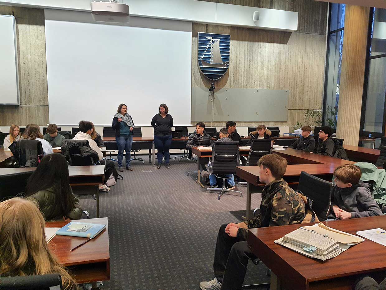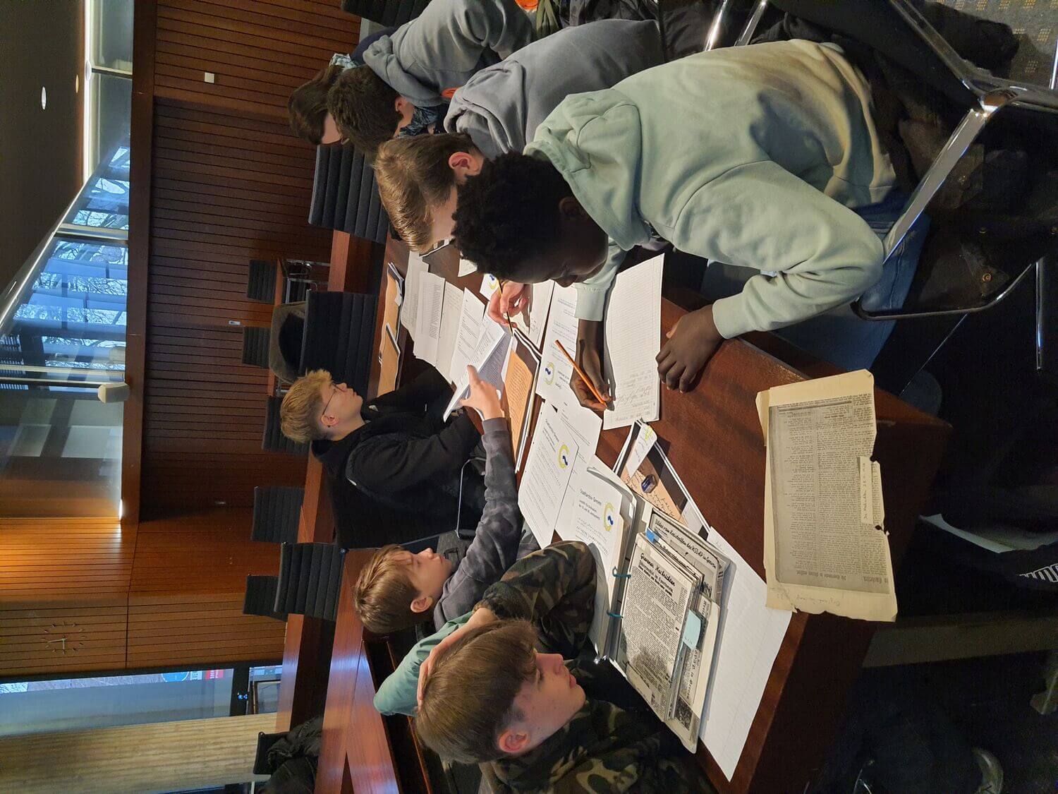 Am Archivtag erforschten die Schülerinnen und Schüler ihre eigene Stadtgeschichte und gingen dabei der Frage nach, wie das Leben und der Alltag der Menschen in Greven während des Nationalsozialismus aussahen. Unter der Anleitung des Teams des Stadtarchivs, vertreten durch Anna Lindenblatt und Lena Böing, beschäftigten sich die Neuntklässler intensiv mit historischen Dokumenten und Quellen. Besonders herausfordernd war der Umgang mit alten Schriftarten und über 80 Jahre alten Originalen, bei dem die Schüler*innen nicht nur ihre Lesekompetenz erweiterten, sondern auch den sorgsamen Umgang mit historischen Quellen erlernten.