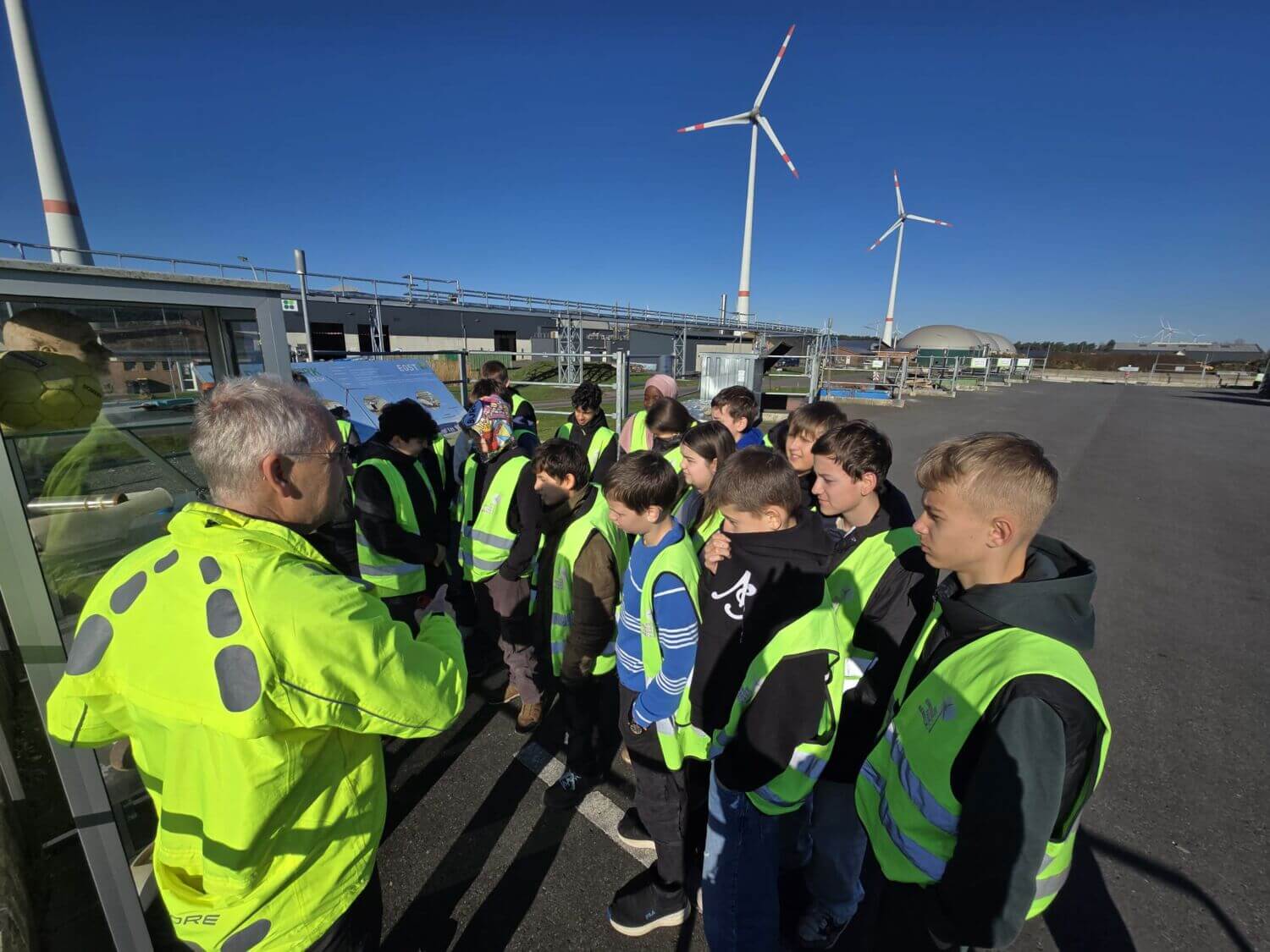In zwei Gruppen erkundeten die Jugendlichen das Gelände: Der MINT-Kurs erhielt eine Einführung in den BioEnergiepark und verfolgte, wie aus Biomüll Biogas und Biokompost entstehen. Dabei ging es auch um korrekte Mülltrennung sowie die Probleme von Kunststoffabbau und Mikroplastik – inklusive des Befunds, dass Mikroplastik bereits im menschlichen Körper nachweisbar ist.