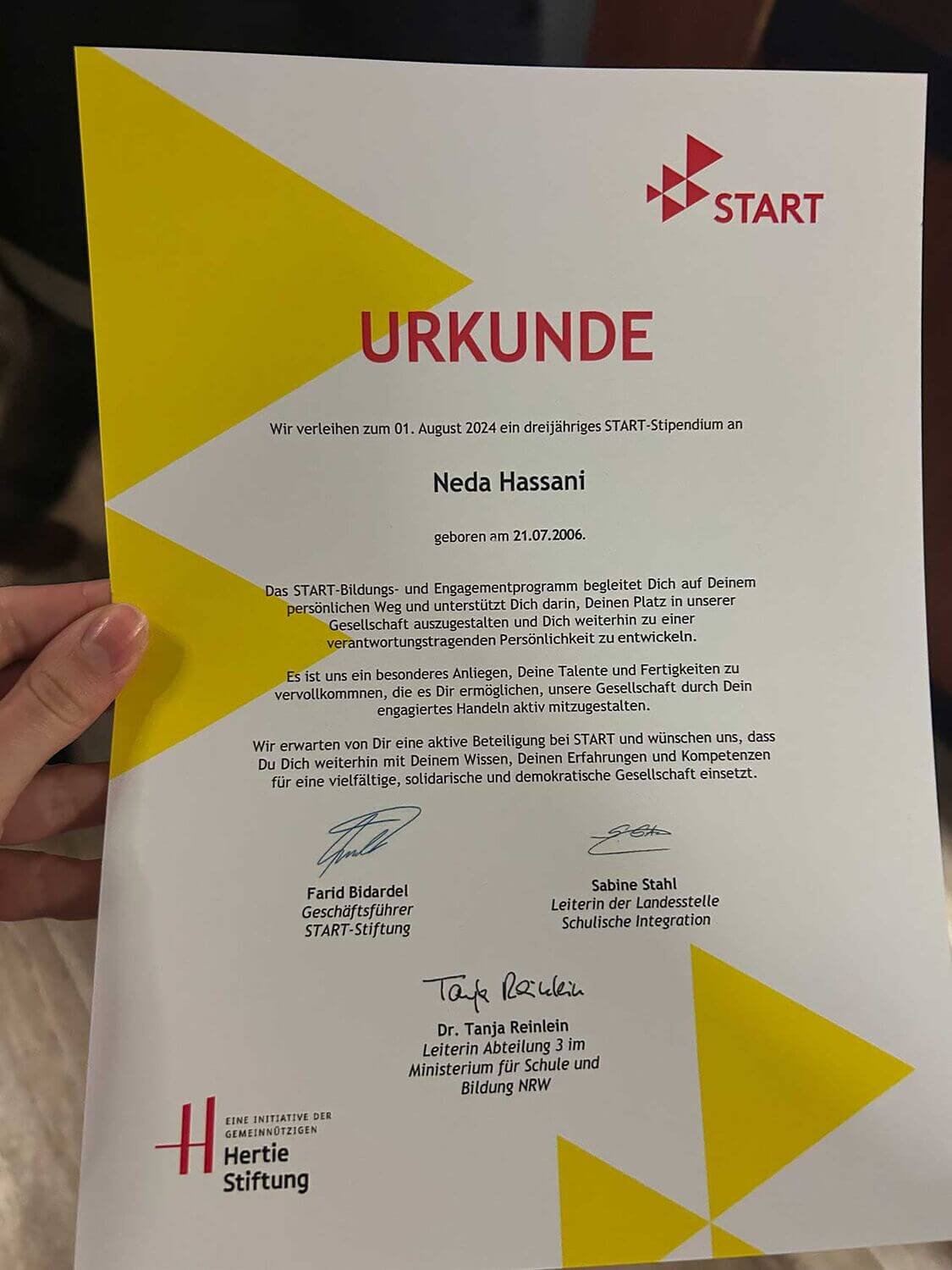 Dank ihrer großen Einsatzbereitschaft und ihres Ehrgeizes wurde Neda für das renommierte START-Stipendium ausgewählt, das sich für Chancengerechtigkeit und die Förderung von Jugendlichen mit Migrationsgeschichte einsetzt. Der Bewerbungsprozess war anspruchsvoll: ein pädagogisches Gutachten, ein umfangreicher Online-Test sowie ein anderthalbstündiges Online-Interview mussten erfolgreich gemeistert werden. Besonders wichtig waren dabei ihre soziale Kompetenz und ihr Engagement innerhalb und außerhalb der Schule.