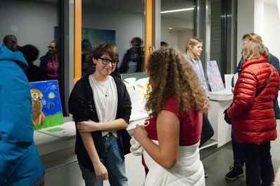 Im Anschluss konnten sich die Besucher die selbst gemalten, bzw. gezeichneten Bildwerke betrachten. Die Schüler hatten entweder das Motiv ihres gewählten Kunstwerkes oder die Malweise des Künstlers, mit dem sie sich beschäftigt hatten, aufgegriffen. Das eigene praktische Arbeiten brachte ihnen den Künstler noch einmal auf einer anderen Ebene näher.