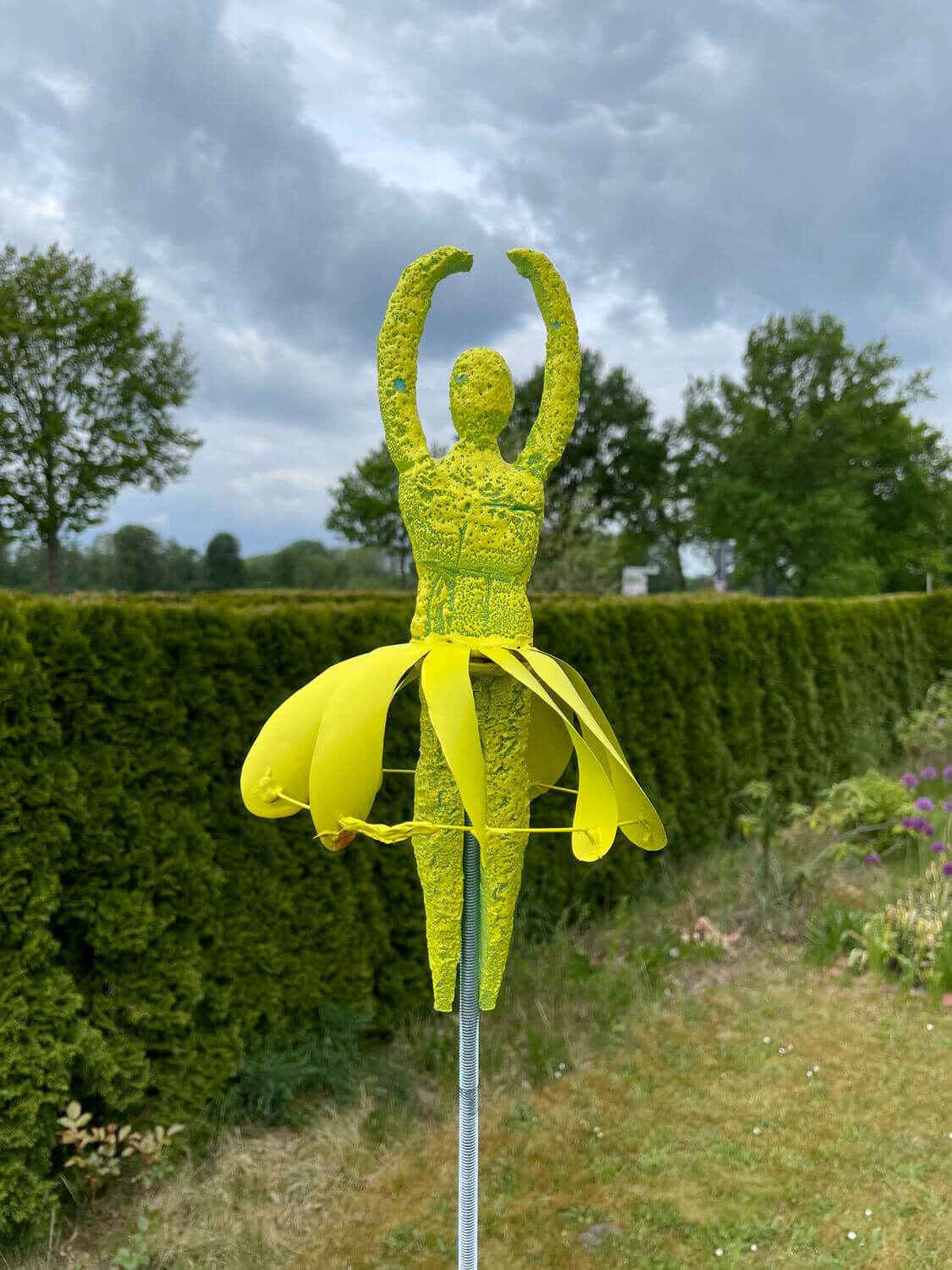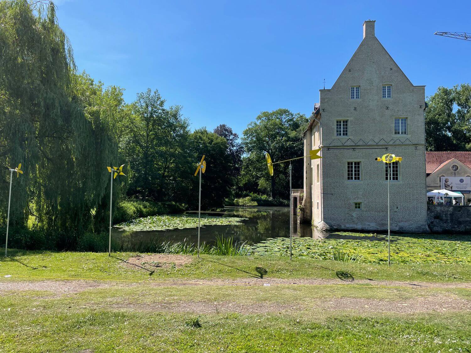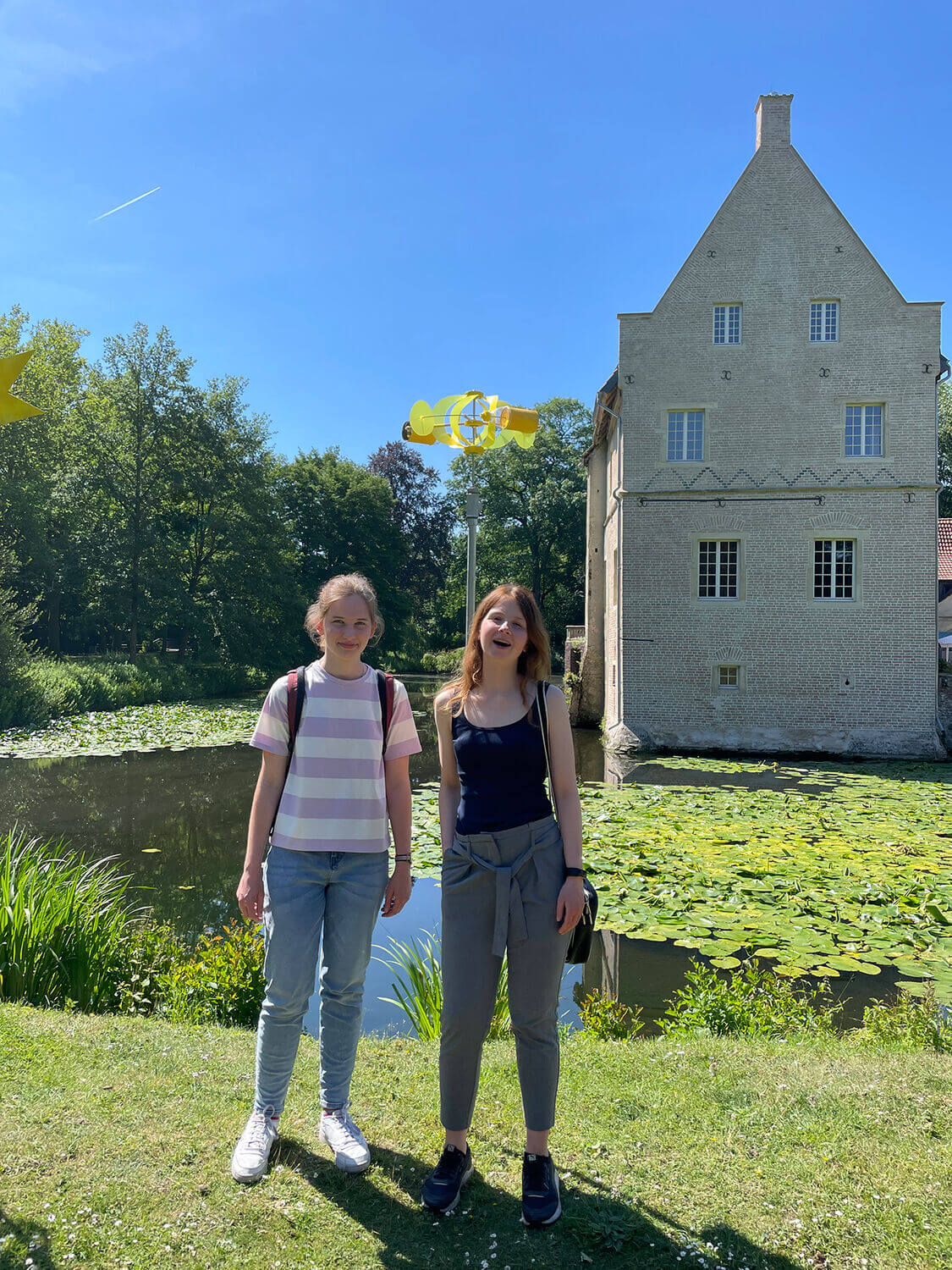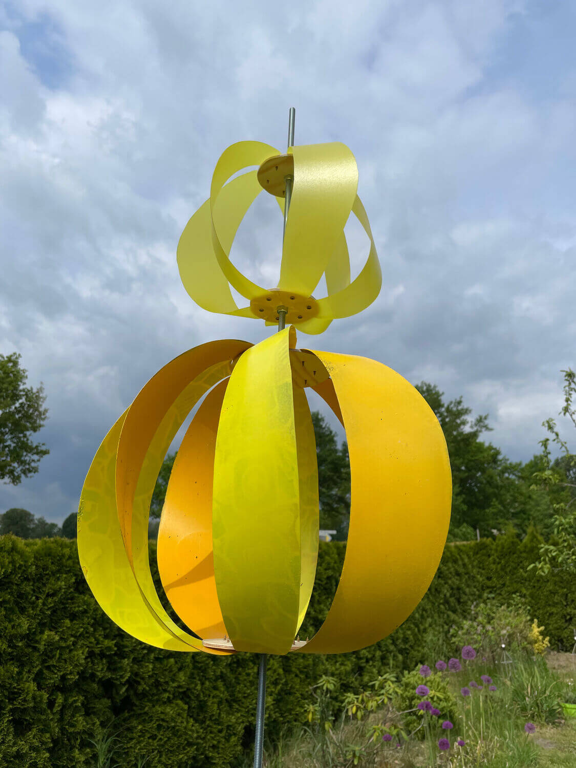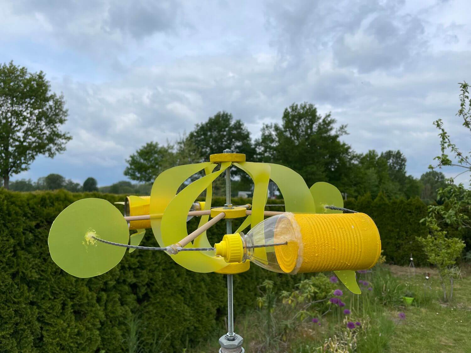 Alle Windräder mussten auf einem verzinkten Rohr montiert werden mit einer Gewindestange als Achse. Die Herausforderung war, diese Gewindestange zur Drehung zu bewegen und gleichzeitig eine spannende, kreative Gestaltung eines Windrades zu finden. Der Zugang zu einer Neuentwicklung eines Windrades fiel den Schüler*innen zu Beginn nicht ganz leicht. Nach spielerischen Experimenten mit verschiedenen Typen von Windrädern und etwas Forschungszeit konstruierten sie jedoch interessante und ungewohnte Windräder.Ein besonders ausgefallenes Exemplar wurde von Aurelia Engel und Sarah Schenk konzipiert. Die beiden Schülerinnen halfen auch beim Aufbau vor Ort im Schloss Senden.