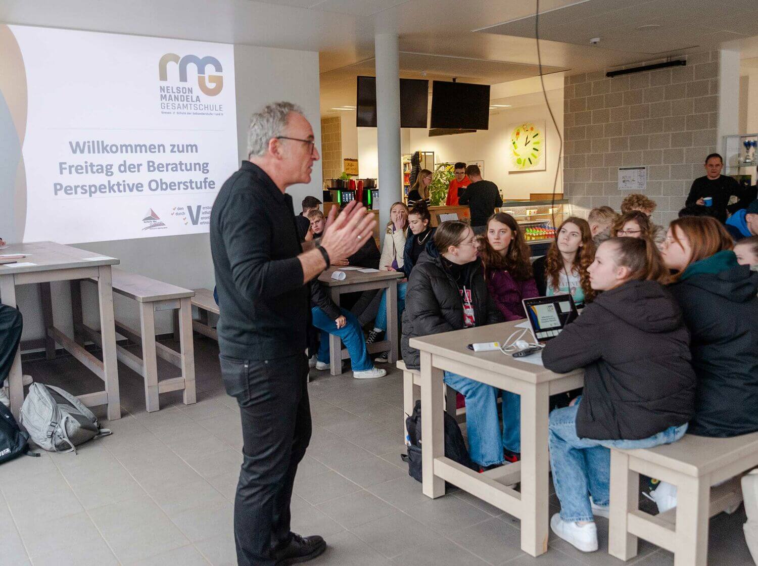 Zunächst begrüßte der Leiter der Oberstufe Ingo Koschinski alle herzlich im Schülercafé „Auszeit eSG“, bevor die Schülerinnen und Schüler individuell ihren Beratungsnachmittag planten: Aus den Bereichen Naturwissenschaften (Chemie, Physik und Informatik), Fremdsprachen (Spanisch und Niederländisch), Kunst und Musik und Gesellschaftswissenschaften (Geschichte, Erdkunde, Pädagogik und Sozialwissenschaften) standen in verschiedenen Räumen Oberstufenlehrende bereit, um konkret auf Inhalte und Anforderungen in den jeweiligen Fächern einzugehen.