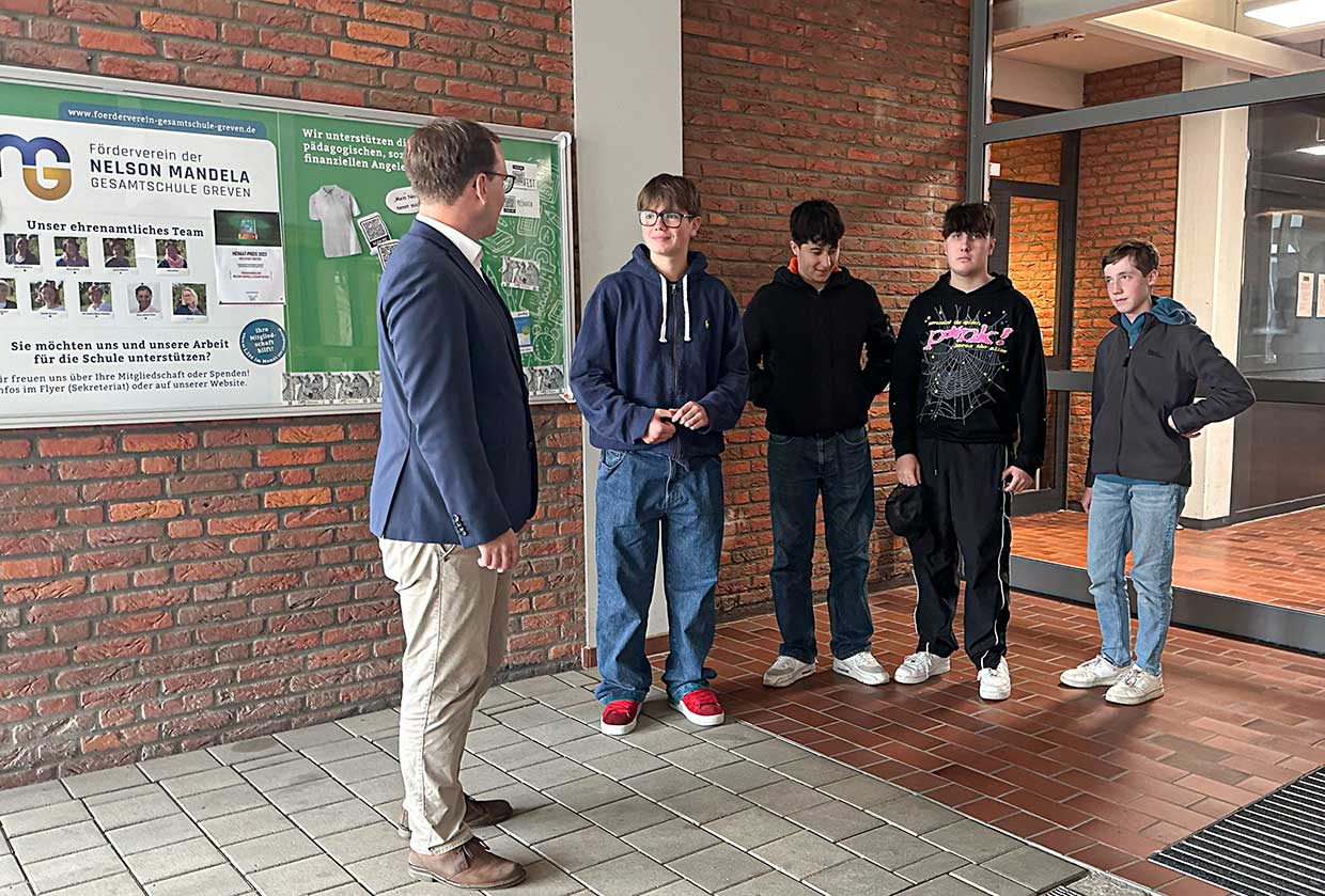 Langfristig strebt die Nelson-Mandela-Gesamtschule es an, die realen Austausche und Begegnungen durch das Euregio-Netzwerk auch für jüngere Schüler*innen weiter auszubauen. Erste interkulturelle Begegnungen sollen durch Tagesbegegnungen und gemeinsame Arbeit in Projekten mit Partnerschulen in der Euregio erleichtert werden. Auf diese Weise soll bereits in der Jahrgangsstufe 6 das Interesse für – später auch längere -Austauschprogramme geweckt werden. „Als Mitglied des EUREGIO-Rates kann ich diese vielfältigen Begegnungsmöglichkeiten natürlich nur unterstützen“, so Aden im Gespräch mit Schulleiter Ingo Krimphoff und den Niederländischlehrenden Fleur Winter, Phillip Klumpe und Moritz Zimmer.