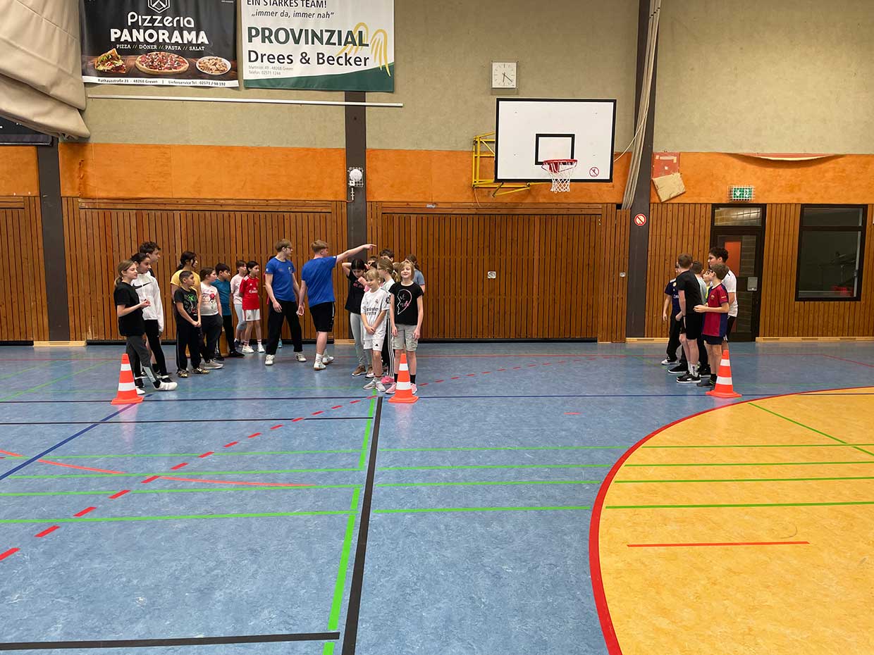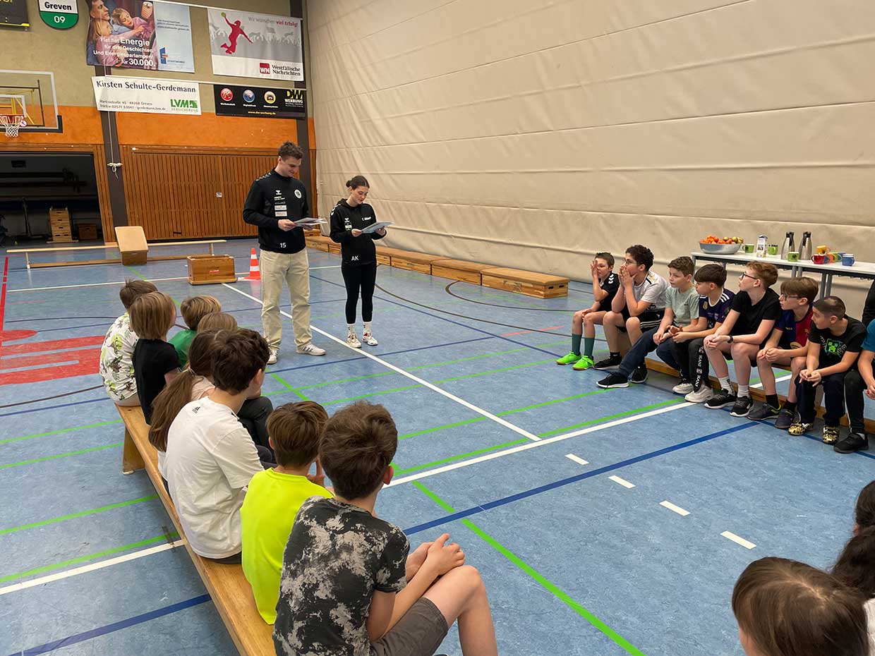 An mehreren Stationen konnten die Kinder ihre handballerischen Fähigkeiten unter Beweis stellen – vom Werfen und Passen bis hin zu Koordinations- und Teamübungen. Ein besonderer Dank gilt dabei fünf Handballprofis aus Greven und Emsdetten, die den Aktionstag tatkräftig unterstützten. Sie standen den Kindern mit Tipps, Motivation und viel Engagement zur Seite und sorgten für echte Profi-Atmosphäre in der Rönnehalle.