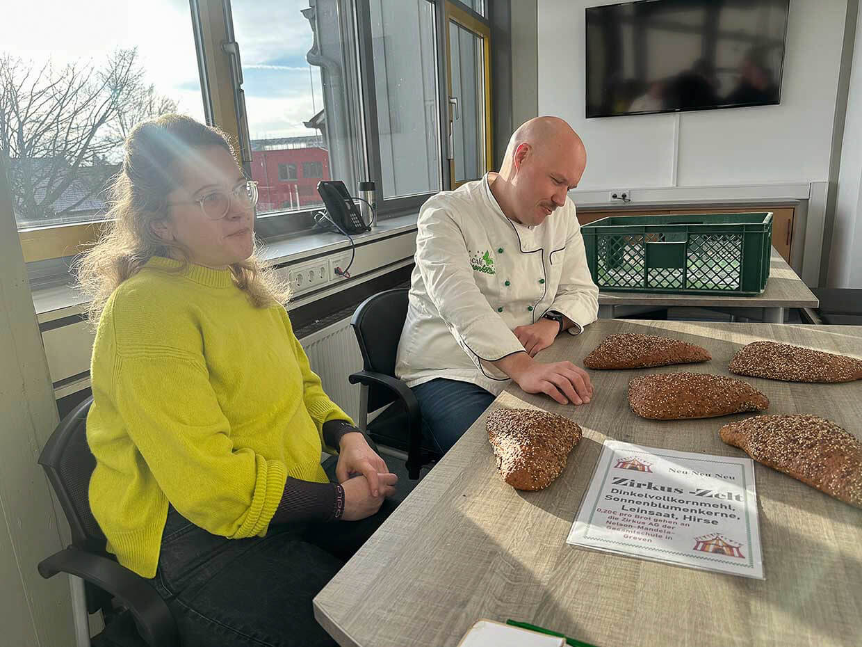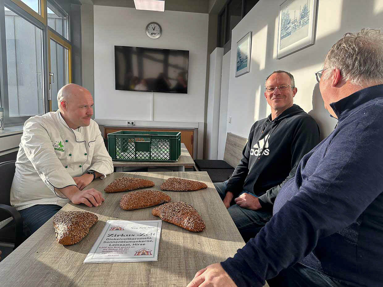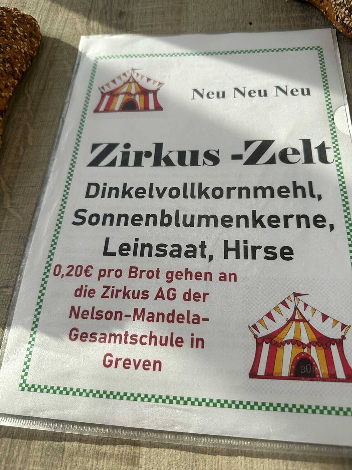 Mit diesem besonderen Spendenbrot unterstützt der Bäcker- und Konditormeister ab sofort die Zirkus-AG der Nelson-Mandela-Gesamtschule Greven. In seinen drei Filialen wird ab sofort ein Brot in Form eines Zirkuszeltes angeboten, von dessen Verkauf jeweils 20 Cent an die schulische Arbeitsgemeinschaft gehen. Das Zirkusbrot besteht aus Dinkelvollkornmehl, Sonnenblumenkernen, Leinsaat und Hirse und ist mit verschiedenen Saaten umhüllt.