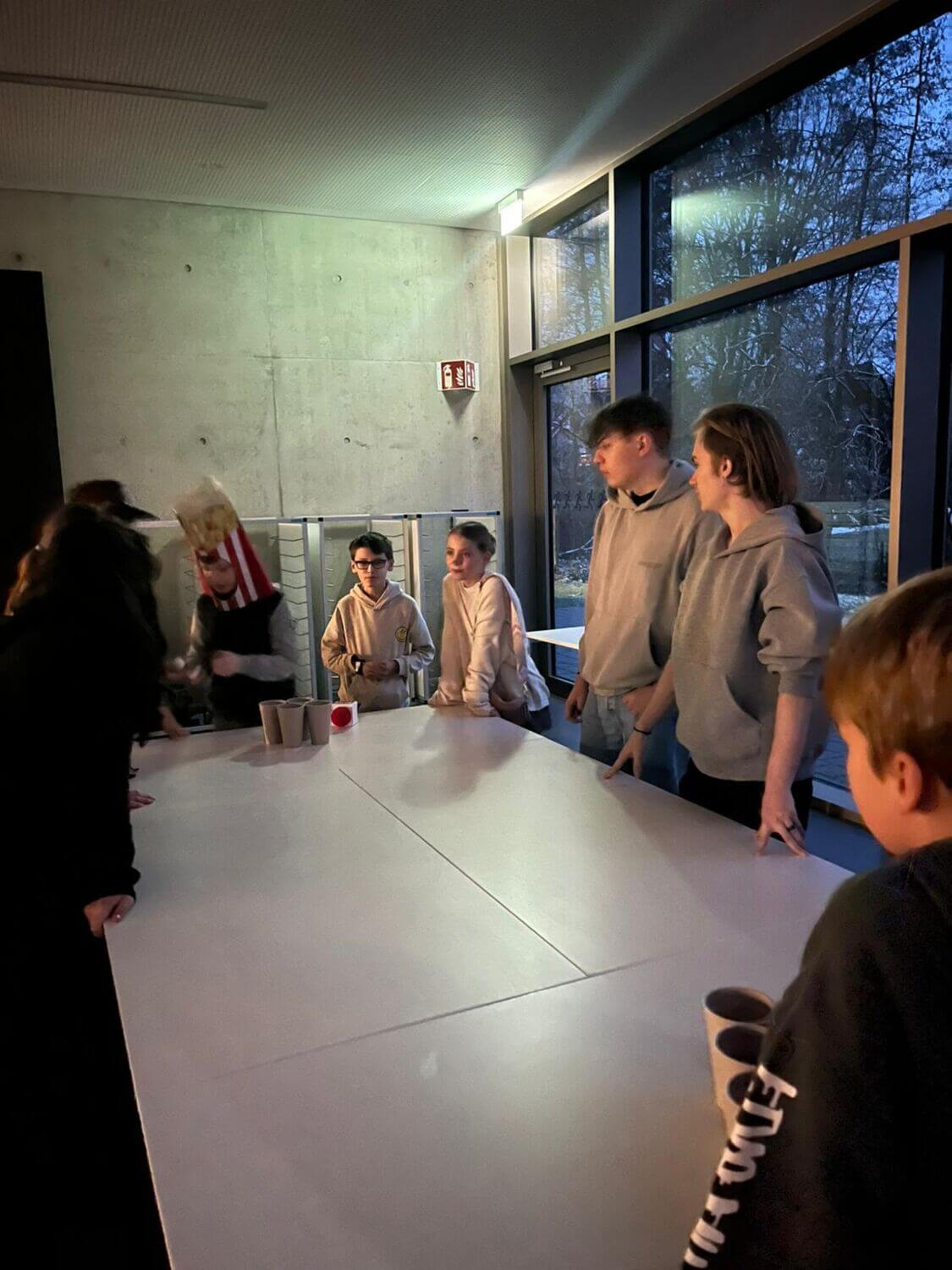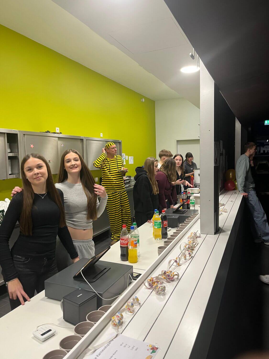 Ab 17:00 Uhr durften dann die Schülerinnen und Schüler der 5. bis 7. Klasse rein. Nachdem sie 1 Euro Eintritt bezahlt hatten, bekamen sie einen Stempel auf die Hand und konnten die bunt geschmückte Mensa betreten – fast wie in einem richtigen Club! Es lief tolle Tanzmusik, es gab eine Taschenabgabe, eine Snackbar und verschiedene kleine Spiele. Zwischendurch gab es immer wieder Durchsagen, damit alle wussten, was als Nächstes passiert.