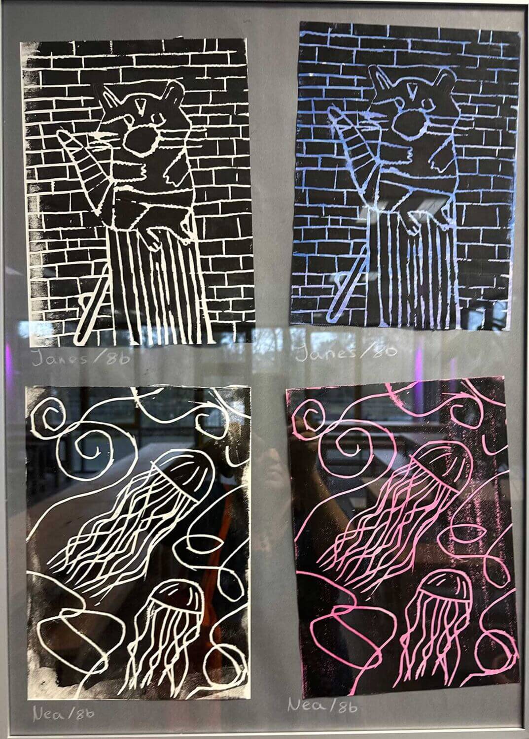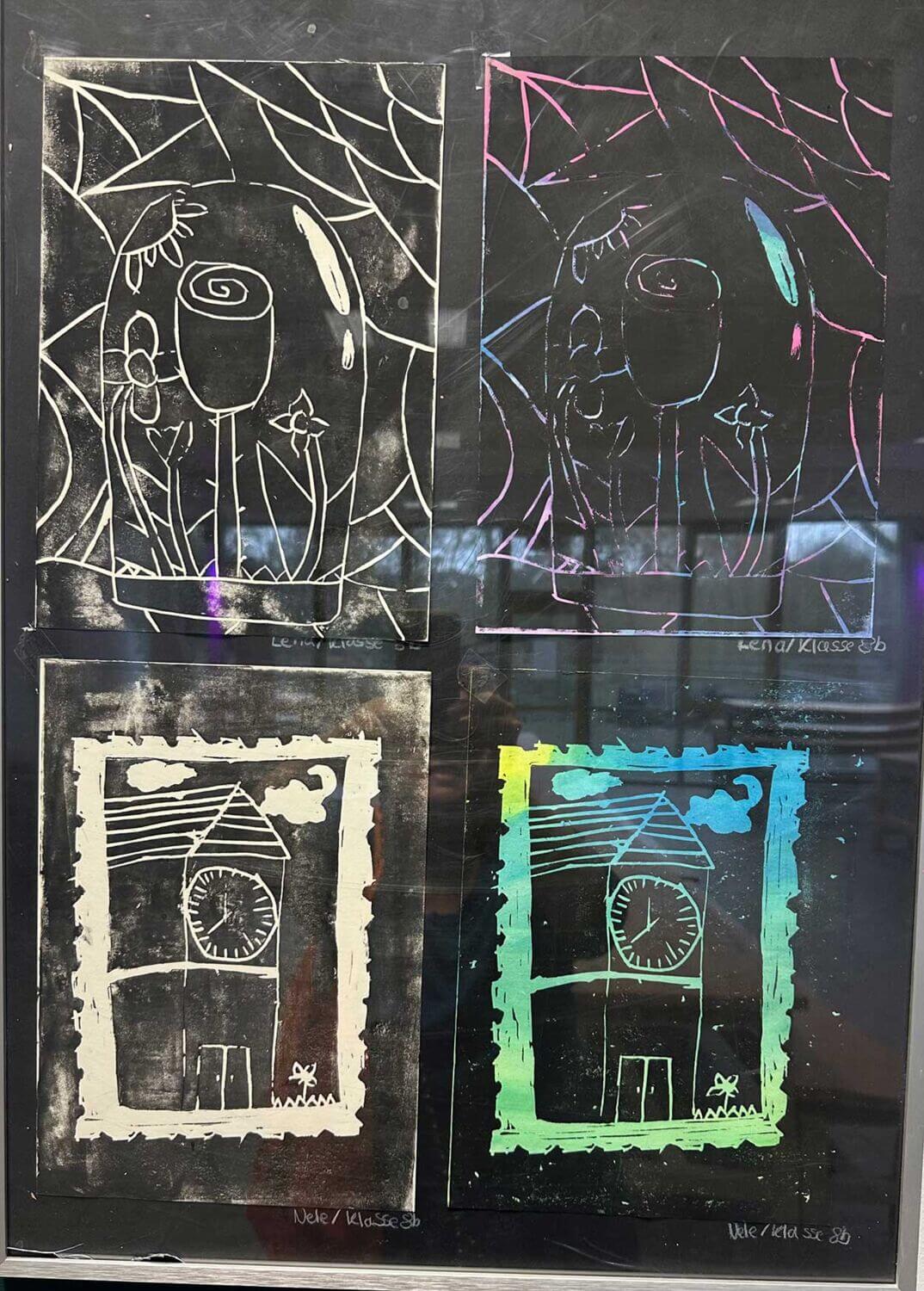 Eine besondere Herausforderung bestand darin, die gesamte Druckfläche bewusst zu gestalten. Beim Linolschnitt bedeutet das, nicht nur das Hauptmotiv, sondern auch Hintergründe, Strukturen und Kontraste sorgfältig zu planen. Durch das Wechselspiel von Schwarz und Weiß entstanden spannende Hell-Dunkel-Kontraste, dynamische Linienführungen und eindrucksvolle Texturen.