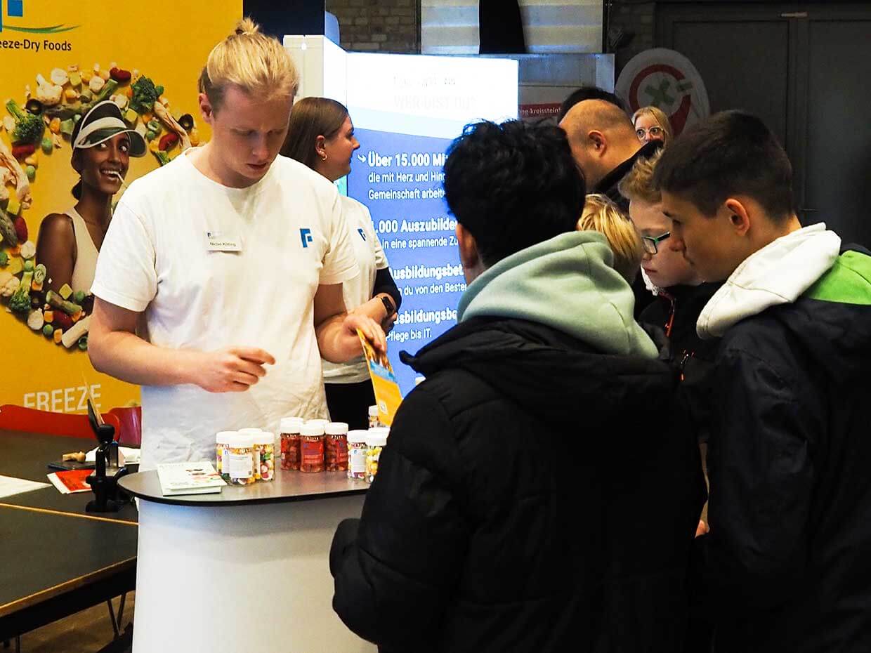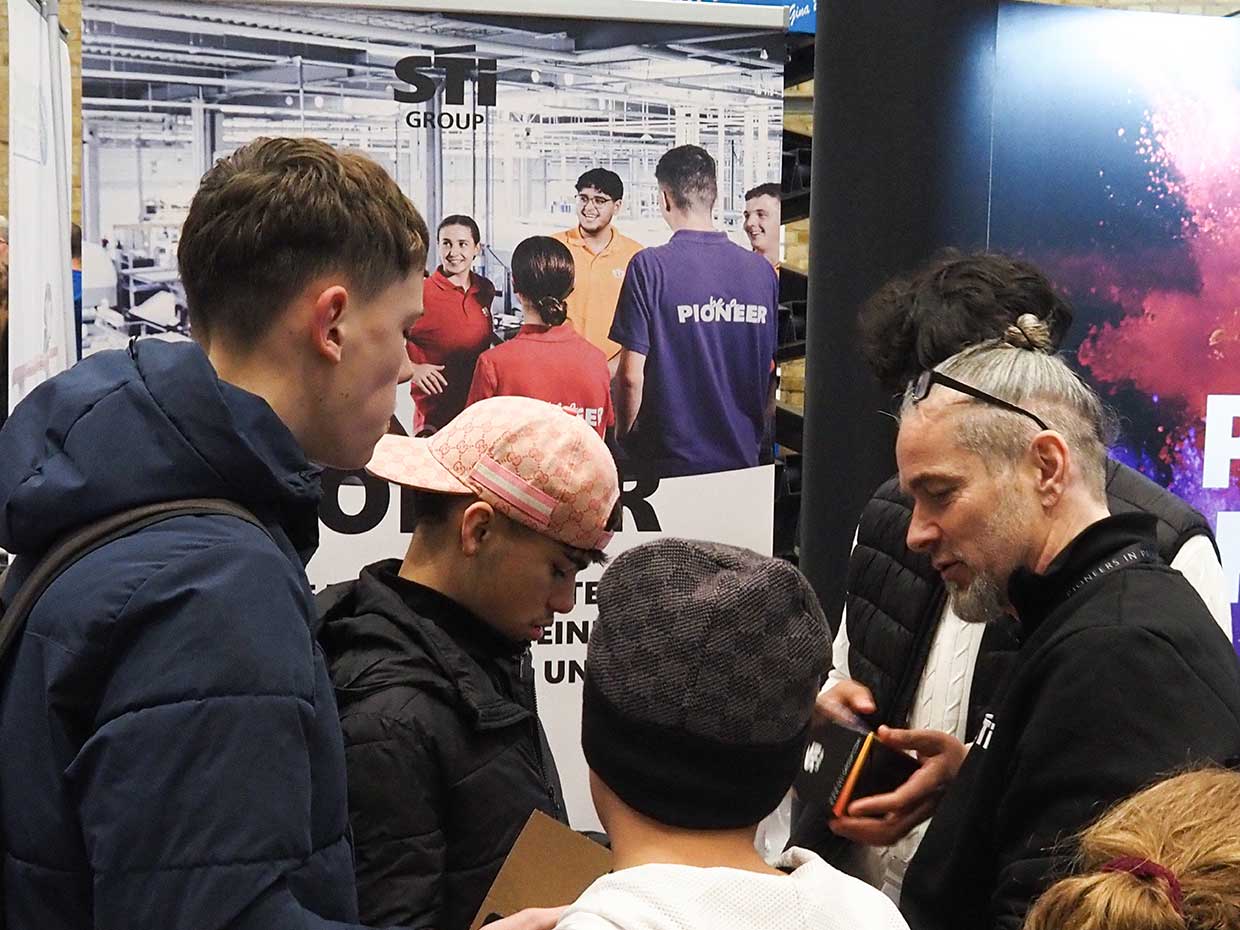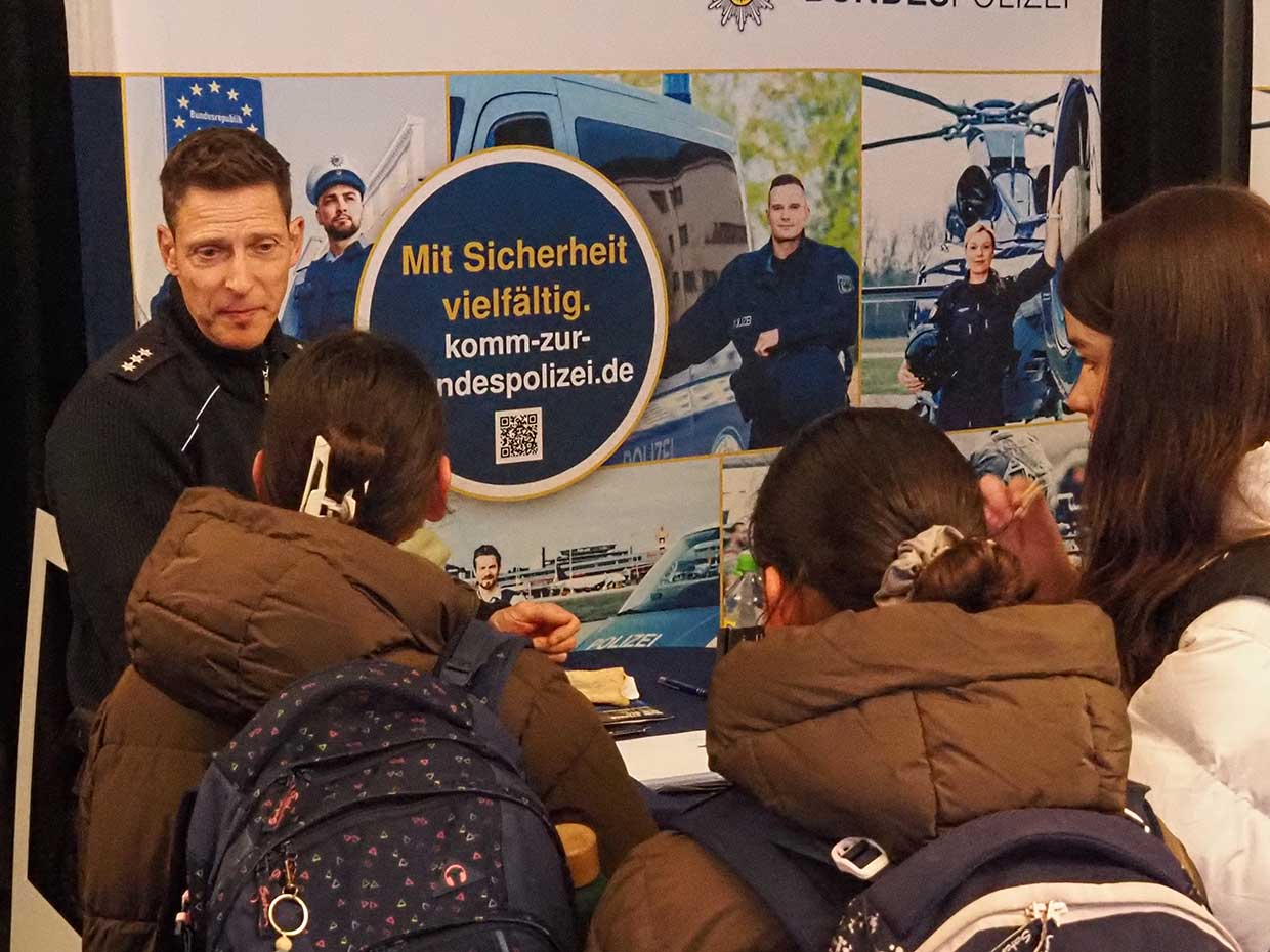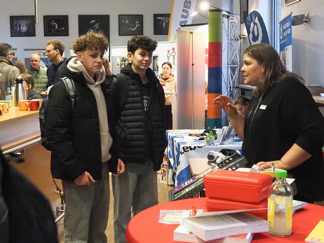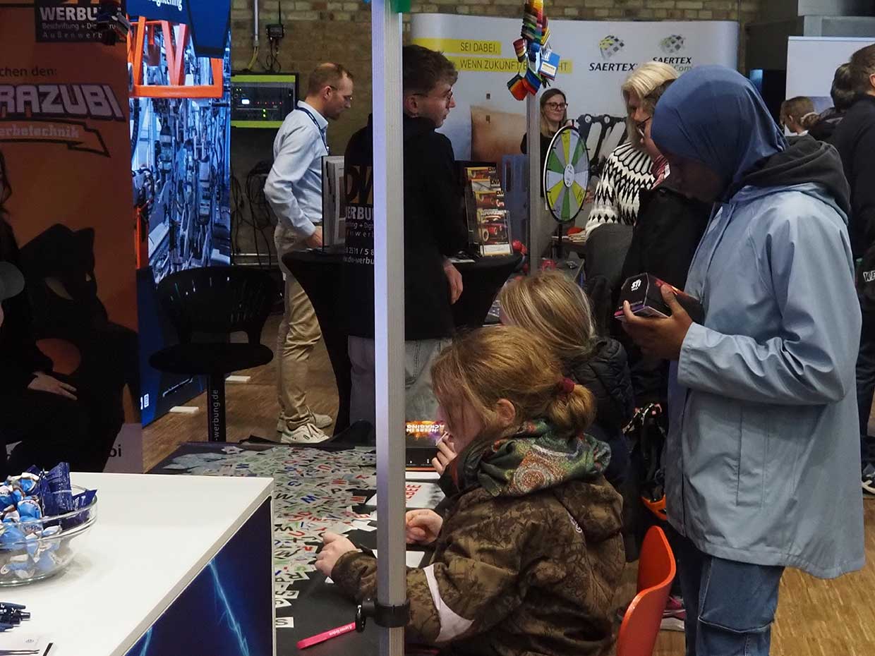 Am Nachmittag war die Messe offen für alle Interessierten – von Arbeitssuchenden über Berufsumsteiger bis zu jüngeren Schülerinnen und Schülern, die sich einfach einen ersten Eindruck verschaffen wollten. So hatte der gesamte 8. Jahrgang sich spontan entschlossen, mit ihren Klassenlehrerteams die Messe in der letzten Stunde zu besuchen.