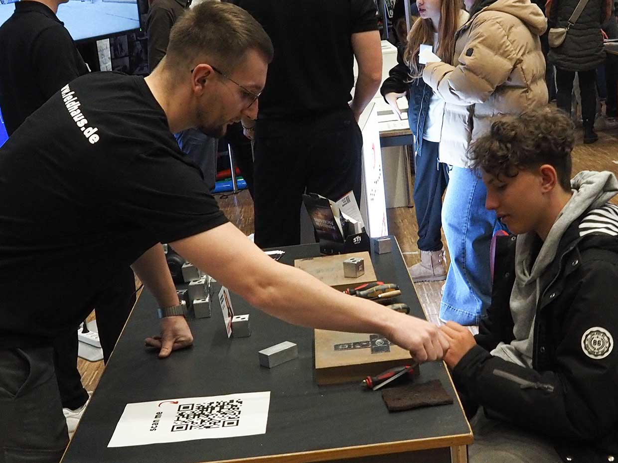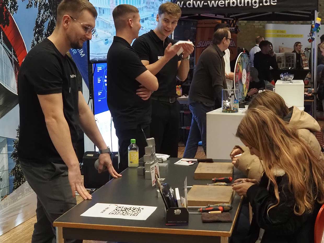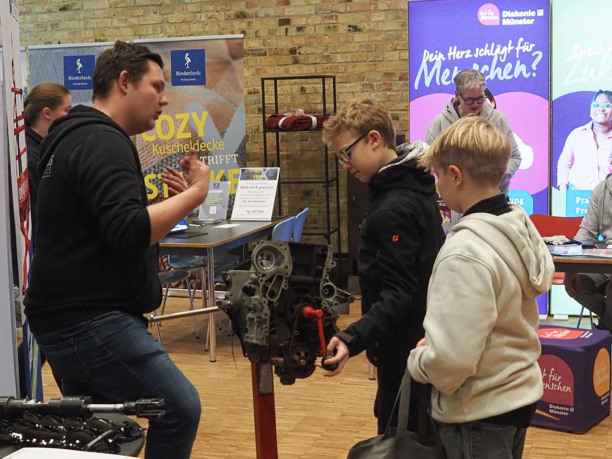 Am Vormittag nutzten die Schülerinnen und Schüler der Jahrgangsstufen 9 und 10 die Gelegenheit, sich auszuprobieren und erste Kontakte zu knüpfen. Viele Betriebe brachten Mitmachstationen mit: Motoren mussten gestartet, kleine Aufgaben gelöst oder Pflanzen gesetzt werden – Anschauen allein reichte hier nicht. Die Messe setzte bewusst auf praktische Erfahrungen, um den Jugendlichen die Vielfalt der Berufe näherzubringen.