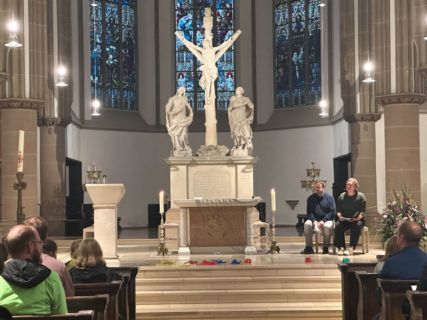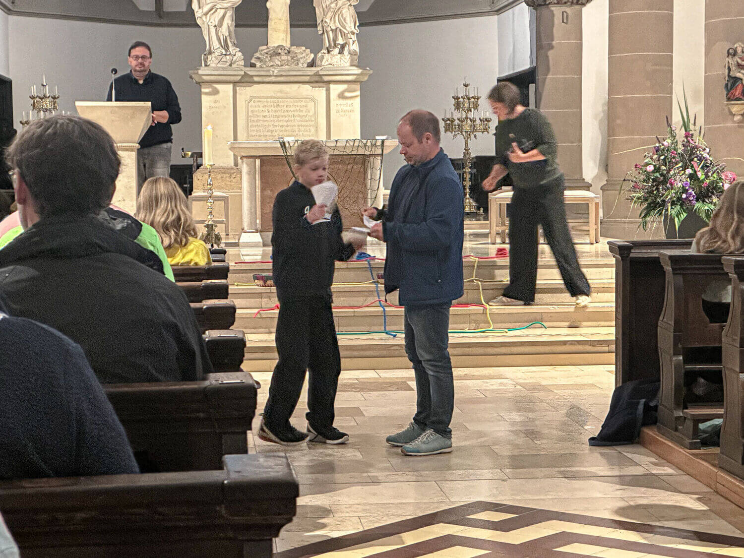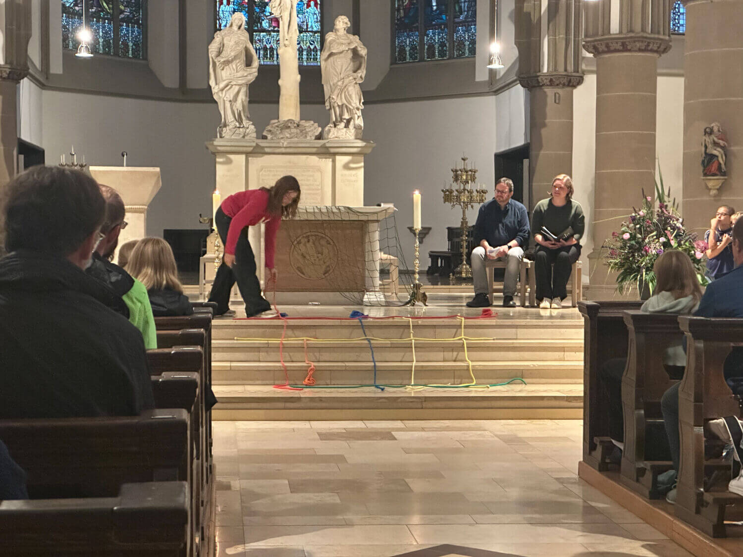 Geleitet wurde die Feier von Gemeindepfarrer Jörn Witthinrich und Pastoralreferentin Lisa Sauer. Unter dem Motto „Ein Netz, das mich trägt“ stand die Frage im Mittelpunkt: Was macht uns zu einer Gemeinschaft und womit fühle ich mich getragen? Kinder aus den sechsten Klassen hatten gemeinsam mit ihren Religionslehrkräften Eva Brandt, Sophie Krukenbaum und Martin Themann den Gottesdienst vorbereitet. Sie legten am Anfang im Altarraum ein buntes Netz aus Seilen und nannten Begriffe wie Liebe, Gemeinschaft, Freunde, Familie und Teamwork als das, was sie trägt.