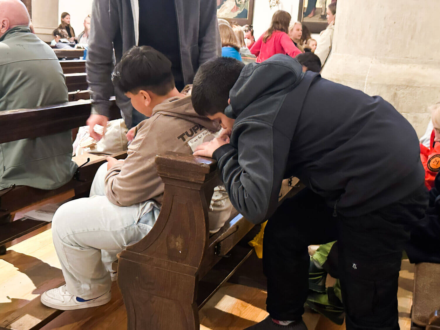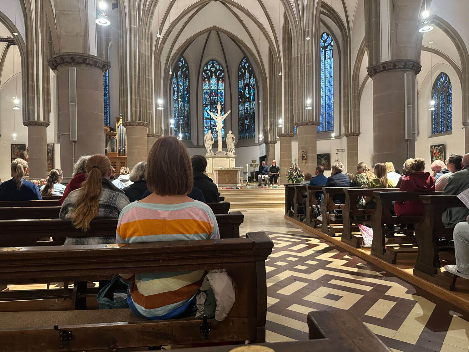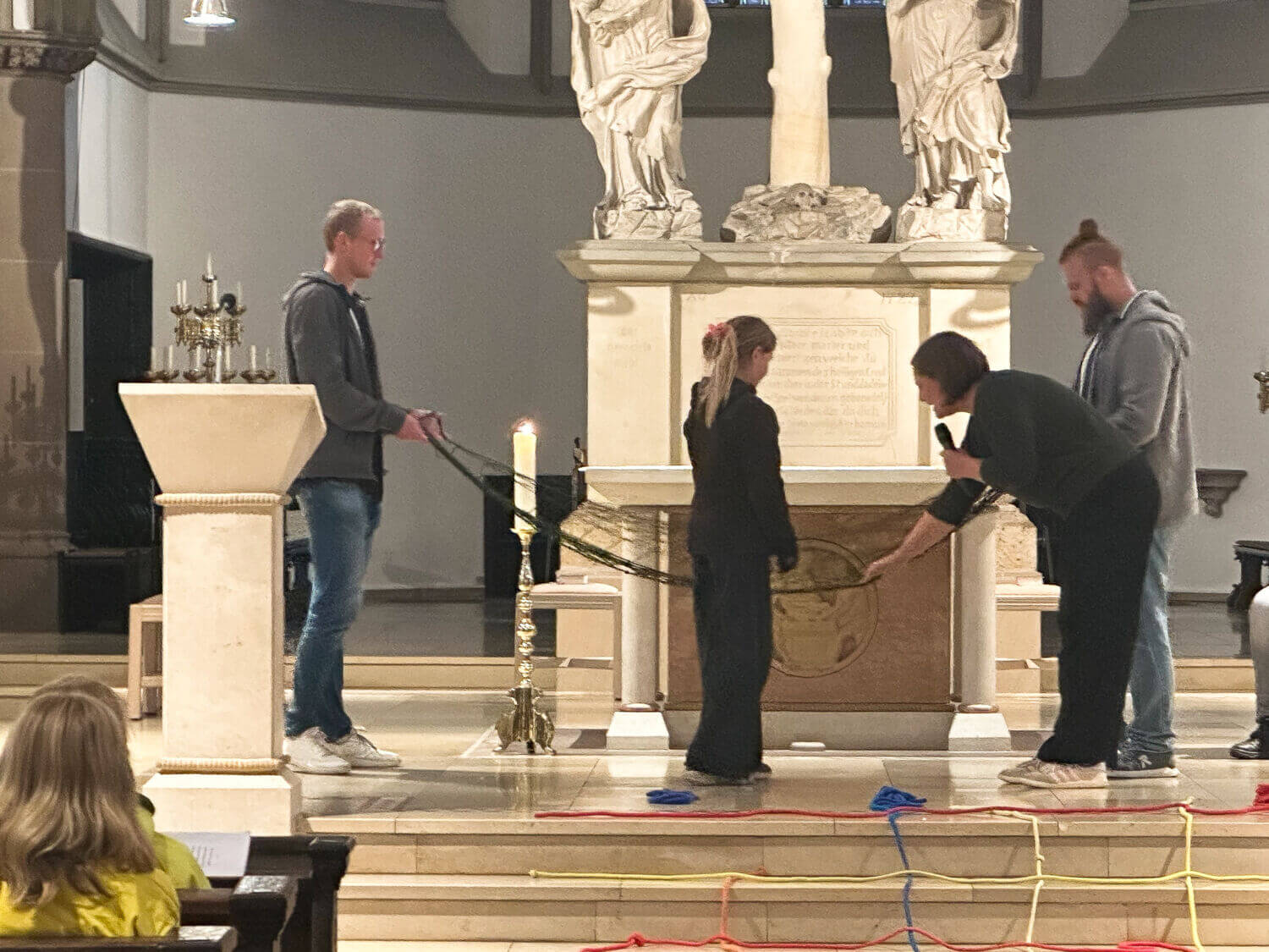 Geleitet wurde die Feier von Gemeindepfarrer Jörn Witthinrich und Pastoralreferentin Lisa Sauer. Unter dem Motto „Ein Netz, das mich trägt“ stand die Frage im Mittelpunkt: Was macht uns zu einer Gemeinschaft und womit fühle ich mich getragen? Kinder aus den sechsten Klassen hatten gemeinsam mit ihren Religionslehrkräften Eva Brandt, Sophie Krukenbaum und Martin Themann den Gottesdienst vorbereitet. Sie legten am Anfang im Altarraum ein buntes Netz aus Seilen und nannten Begriffe wie Liebe, Gemeinschaft, Freunde, Familie und Teamwork als das, was sie trägt.