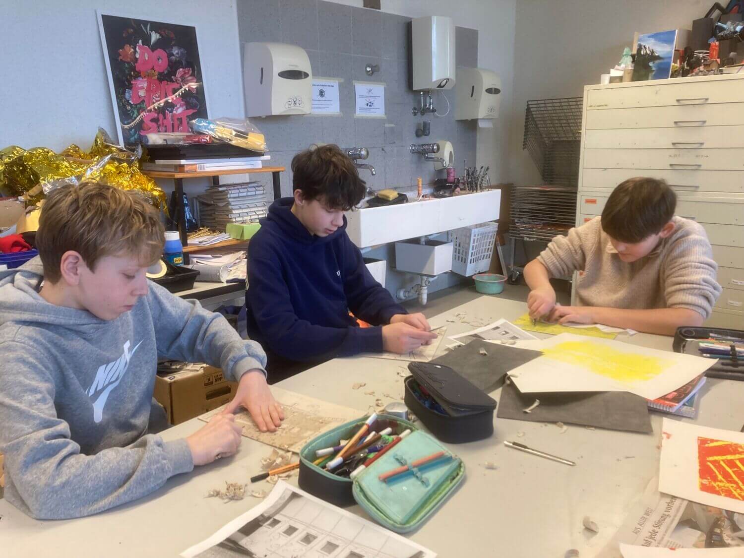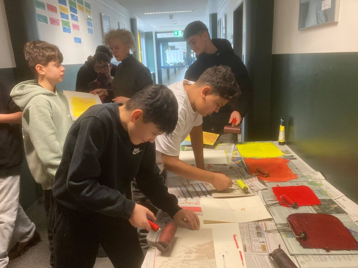 Auch praktische Workshops gehörten zum Programm: In den unteren Klassen gestalteten die Schülerinnen und Schüler Stofftaschen und Rucksäcke. Mit der südafrikanischen Drucktechnik „Cardboard-Printing“ entstanden farbenfrohe und kreative Kunstwerke, die den Projekttag nicht nur inhaltlich, sondern auch künstlerisch bereicherten.