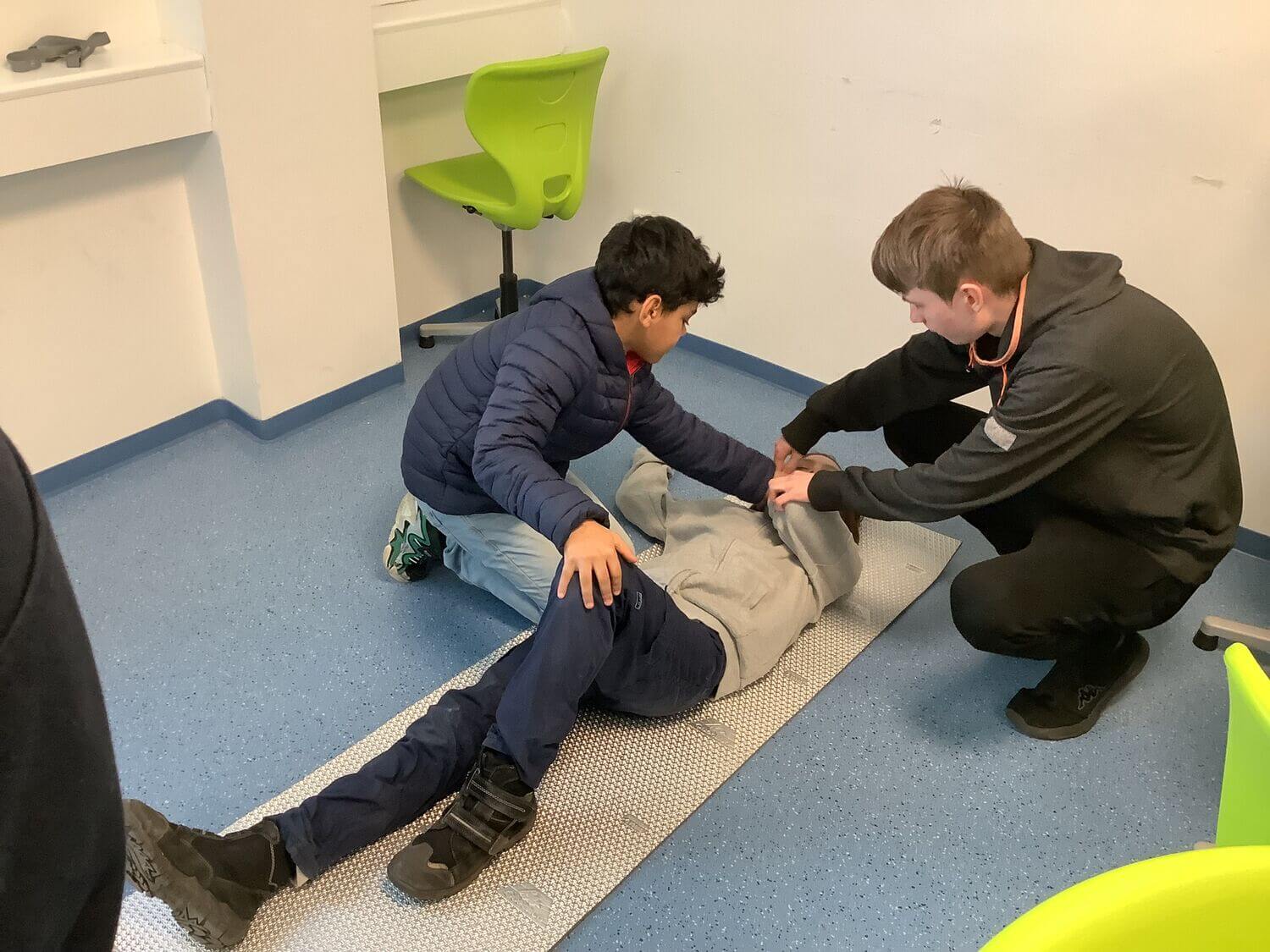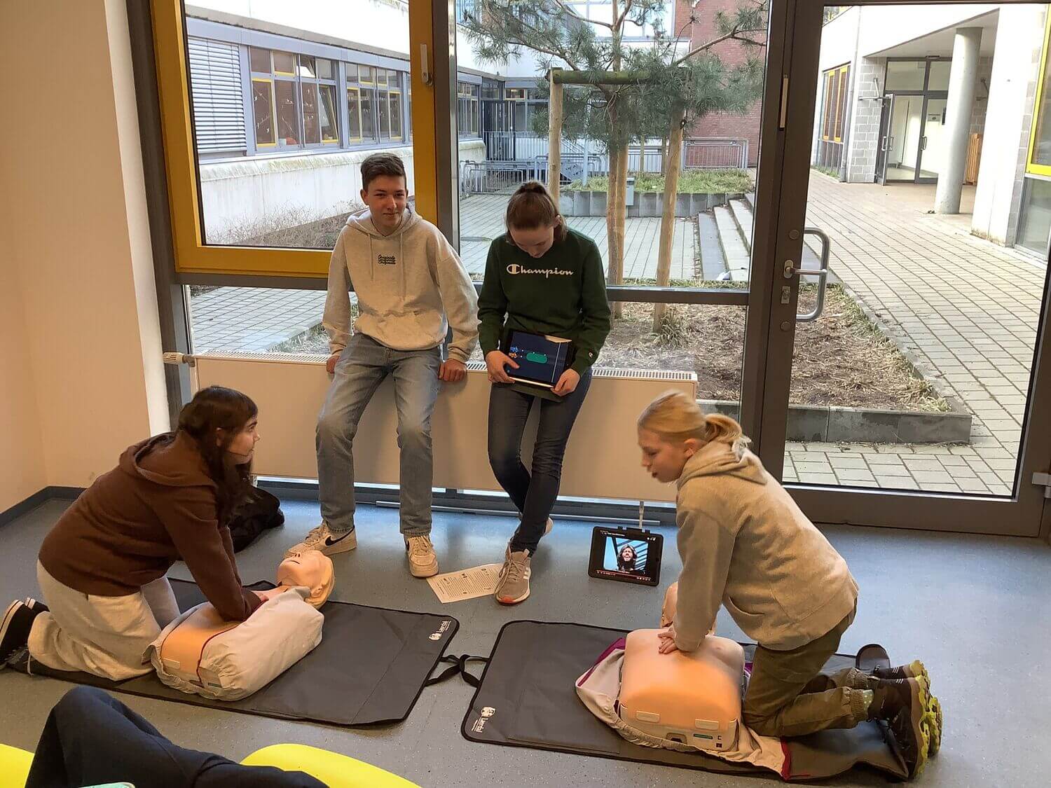 Geschult wurden sie dabei von den Schulsanitär:Innen aus dem Jahrgang 10, die ihnen demonstrierten, wie man einen Druckverband anlegt, was man tut, wenn sich jemand verschluckt, wie ein Notruf abgesetzt wird , wie bewusstlose Personen versorgt werden und wie eine Herzdruckmassage durchgeführt wird. Und eine wichtige Botschaft haben sie obendrein gelernt. Es ist nicht schlimm, wenn sie bei der ersten Hilfe nicht perfekt handeln, denn jede Hilfe ist besser als keine Hilfe.