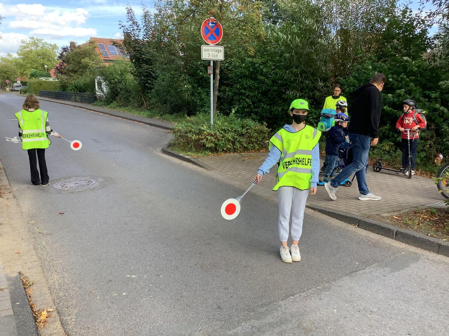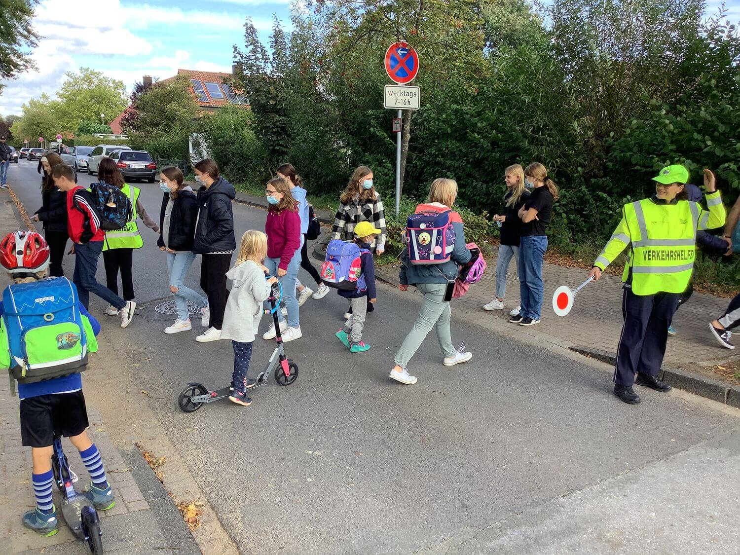 Der Einsatzplan der Schülerlotsen hängt nun für alle sichtbar im Schaukasten des Foyers und liegt im Sekretariat aus. Nach ihrer Motivation gefragt, sich zum Verkehrshelfer ausbilden zu lassen, gaben einige an, sich für den Beruf des Polizisten zu interessieren. „Wir wollen gerne den Grundschülern dabei helfen, sicher zur Schule zu kommen. Ich weiß noch genau, wie schön das war, als ich so klein war“, erinnert sich Veronika und hebt anschließend ihre Kelle, um wieder einen Schwung I-Dötzchen über die Straße zu lassen.