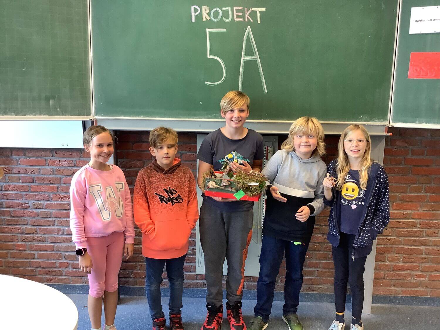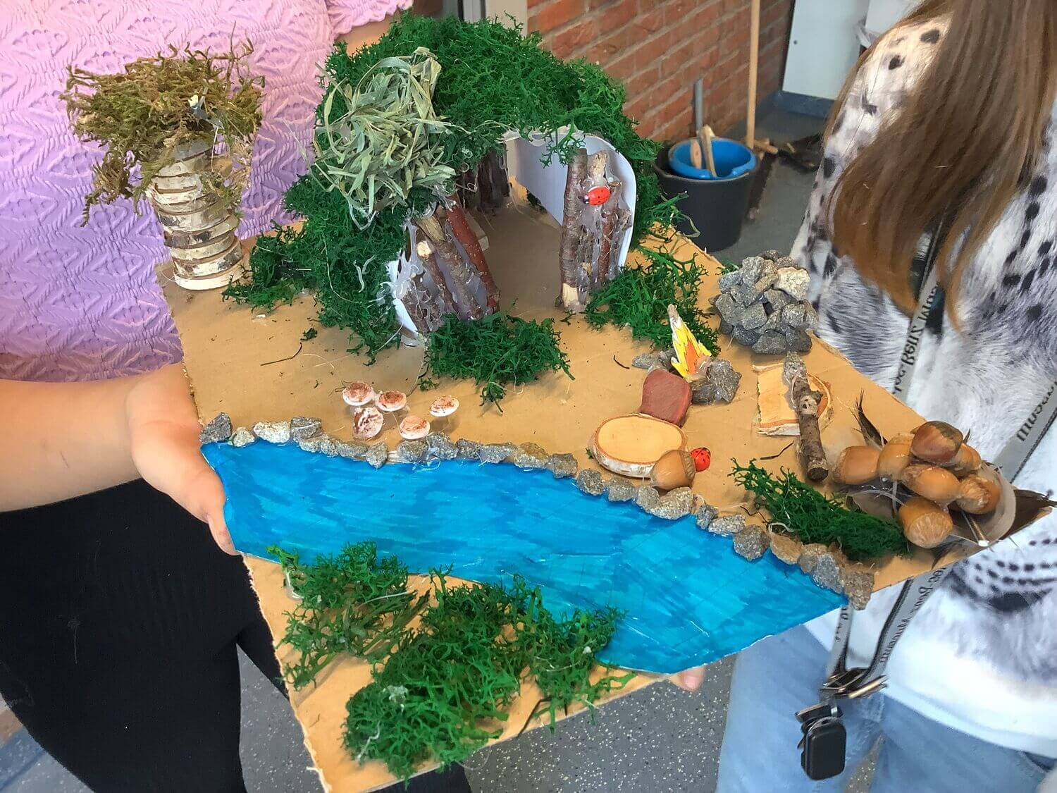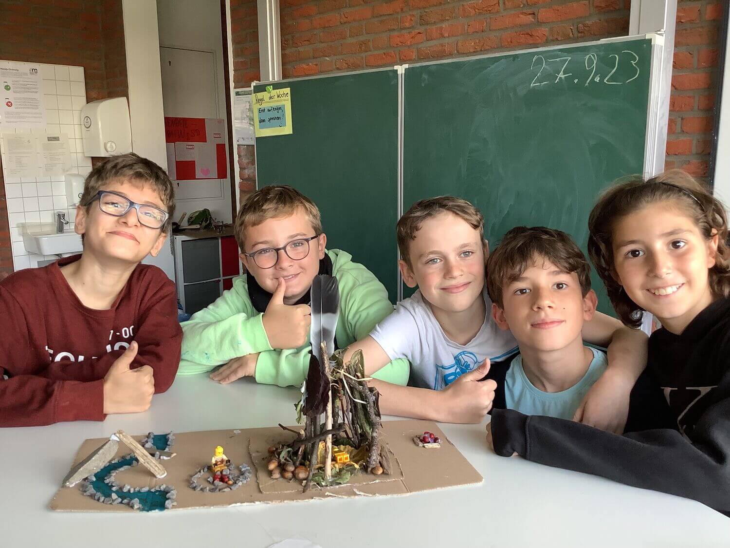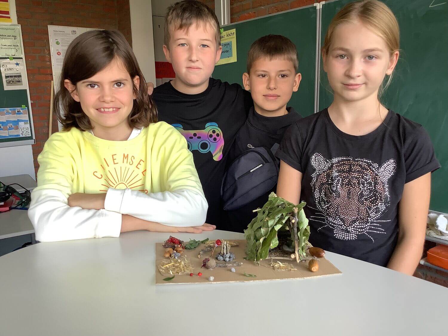 Um sich dem Thema auch praktisch anzunähern, bauten die Schüler:innen in Kleingruppen Modelle von Steinzeithütten, die sie anschließend ihrer Klasse in kurzen Vorträgen präsentierten. Dafür sammelten die Kinder verschiedene Materialien aus der Natur, die sie anschließend in ihren Modellen verbauten.
