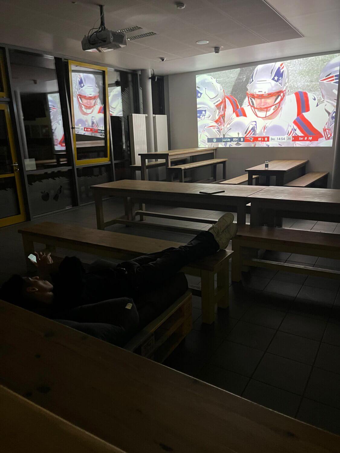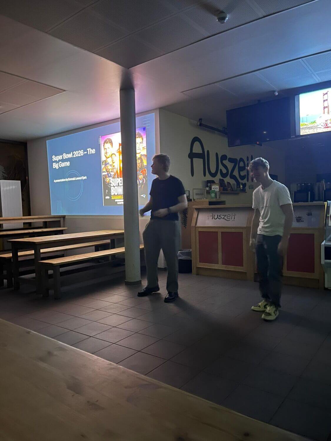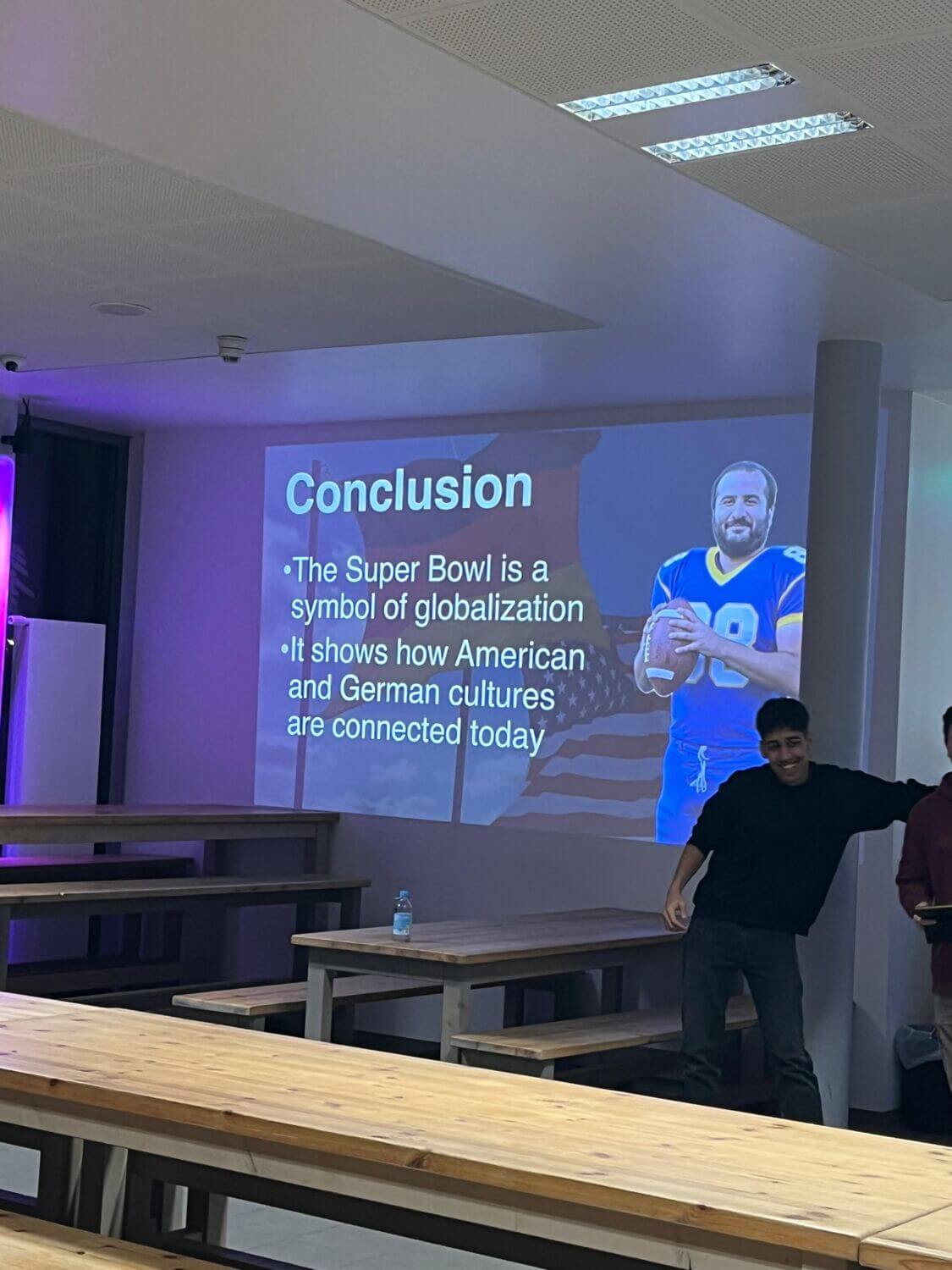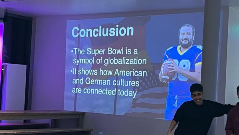 During the evening, students gave presentations in English on various aspects of American culture. Topics included the rules of American football, profiles of the two finalists, the Seahawks and the Patriots, as well as a presentation focusing on German-American relations. Especially in light of current political tensions, the importance of the relationship between the two countries was discussed and reflected upon.