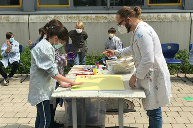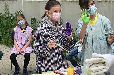Da das fast schon sommerliche Wetter mitspielte, versammelten die Kinder sich anschließend für Kennlernspiele draußen im Innenhof des Schulgebäudes. Um direkt ihre Spuren zu hinterlassen, druckte jedes einzelne Kind seinen farbigen Handabdruck auf eine Klassenleinwand: die erste Dekoration des neuen Klassenraums, inzwischen eine schöne Tradition der Gesamtschule. Dieses Bild begleitet die Klasse dann durch die nächsten sechs Schuljahre in jeden neuen Klassenraum.