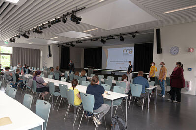 Direkt am Eingang der neuen Mensa erhielten die Eltern ein Willkommenspaket mit allen wichtigen Informationen rund um den Schulstart nach den Sommerferien. Anschließend wurden sie von dem Schulleiter Herrn Krimphoff, der Abteilungsleiterin Frau Veber und dem zukünftigen Klassenleitungsteam begrüßt, bevor die Kinder von ihren Lehrern in ihre neuen Klassenräume geführt wurden.