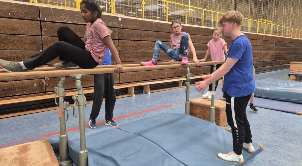 Der EF-Übungsleiterkurs der Nelson-Mandela-Gesamtschule Greven hat im Rahmen seiner Ausbildung eine vielseitige Bewegungslandschaft für die zweiten Klassen der Mariengrundschule konzipiert und umgesetzt.