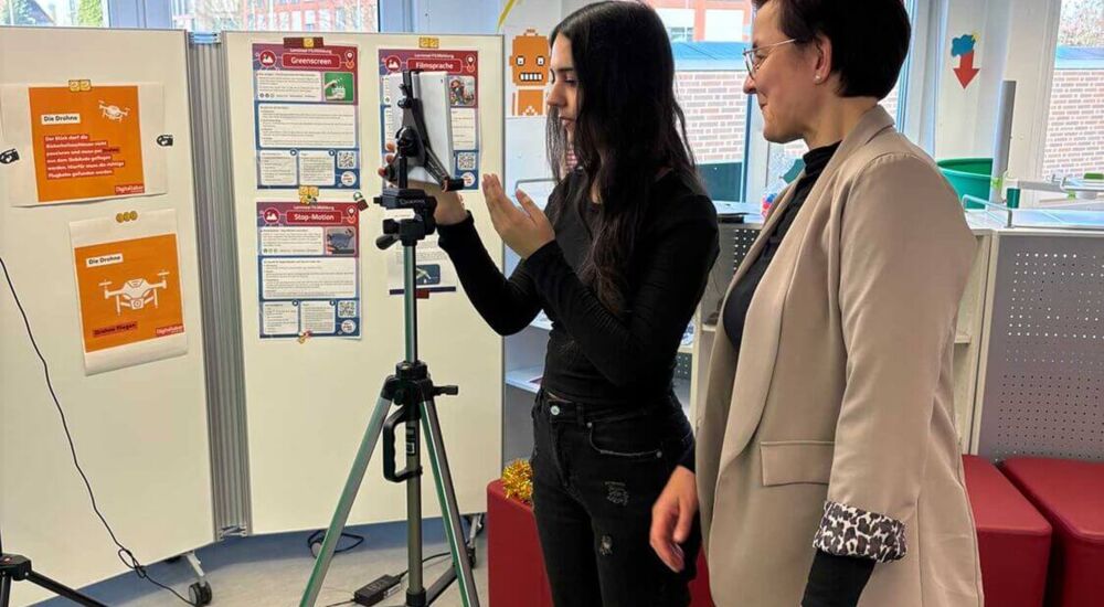 Vier Schülerinnen der Nelson-Mandela-Gesamtschule Greven – Marit Hirsch, Nuri Pamaj, Mia Wagner und Fatjona Delija – begleitet von ihrer Ausbildungslehrerin Sandra Rindelhardt, nahmen am vergangenen Donnerstag an der Medienscouts Convention NRW in Duisburg teil.