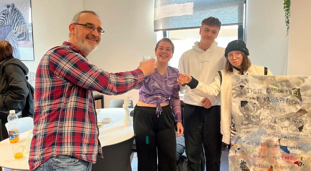 „Wow, das berührt mich“ sagt Schulsozialarbeiter Hans Tellmann beinahe andächtig, während er vor diesem Bild steht, das in der Auszeit ausgestellt ist. „Das will ich haben“. Urheber*innen des Werks sind die Q2 Schüler*innen Anna Saschek, Claudia Karolak und Colin Mensing.