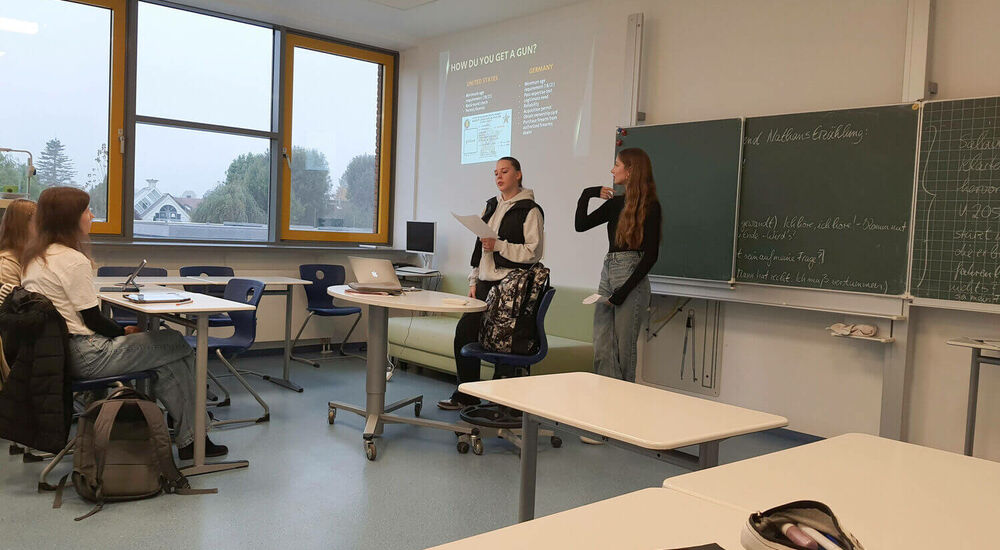 Wir halten gerne ein paar Mal im Schuljahr freiwillige Referate in unserem Englisch E-Kurs der zehnten Klasse bei Herrn Kocak. Dieses Mal hatten wir uns für das Thema “Gun laws in the US" (Waffengesetze in den Vereinigten Staaten von Amerika) entschieden, da dieses Thema aktuell viel diskutiert wird und für uns persönlich ebenfalls total interessant ist. Außerdem ist unser E-Kurs sehr vom amerikanischen Englisch geprägt, deshalb macht man Herrn Kocak mit solchen Themen immer wieder eine Freude ;).
