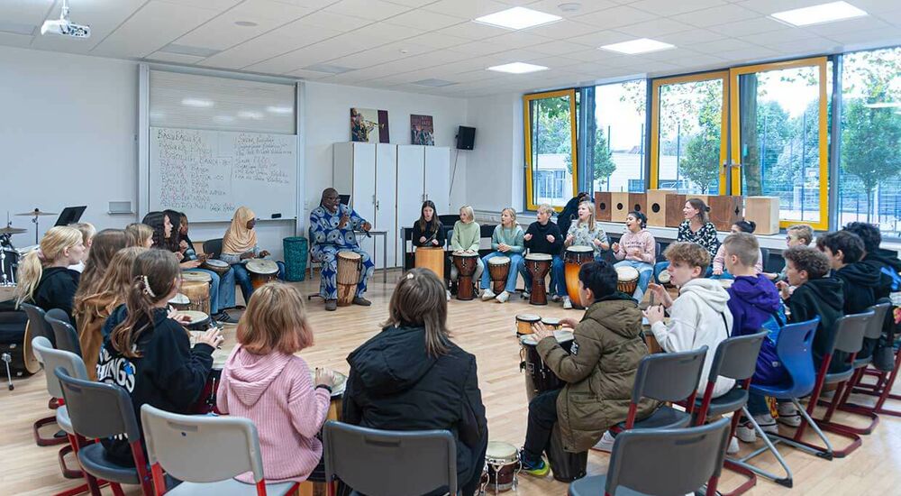 Wundersame Klänge waren auf den Fluren zu hören, dazu Schülerstimmen, die rhythmisch „My body shaking, bodobodo“ oder „Basubasuka, logoligi bansa-hey“ sangen. Das konnte nur eins bedeuten: Morphius Eurapson-Quaye war wieder da, um mit Kindern der Jahrgangsstufe sechs zu singen und zu trommeln.