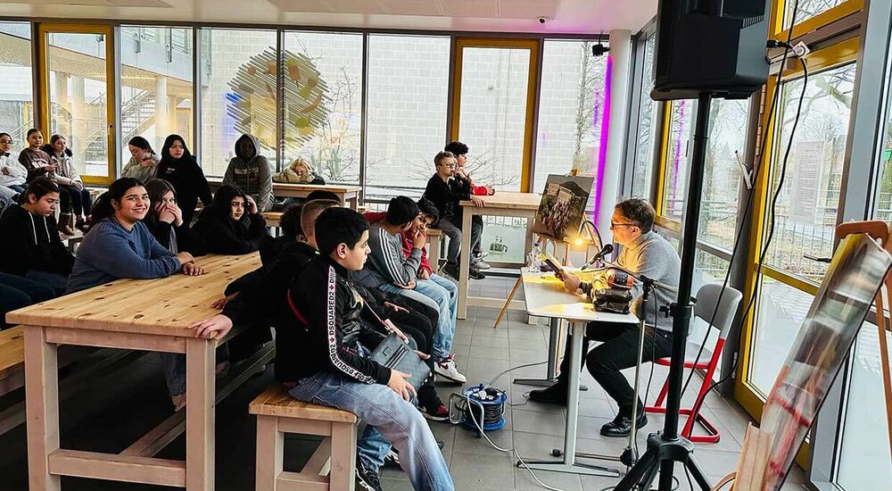 Eine ganz besondere Unterrichtsstunde nicht im Klassenraum an Schulbänken, sondern im Schülercafé „Auszeit eSG“: Carsten Bender, freier Schauspieler und Sprecher aus Münster, las auf Einladung der Nelson-Mandela-AG aus dem Buch „African Kids“ von Lutz van Dijk vor.