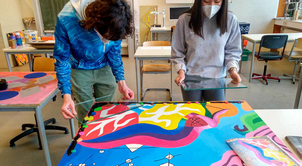 Viele unbespielte, weiße Flächen in den Räumen, die im Lauf der Renovierung und des Neubaus der Gesamtschule entstanden sind, schreien geradezu danach, gestaltet zu werden. Das sahen auch die vielen kreativen und kunstinteressierten SchülerInnen in einem der beiden Kunstkurse der Q1 so.