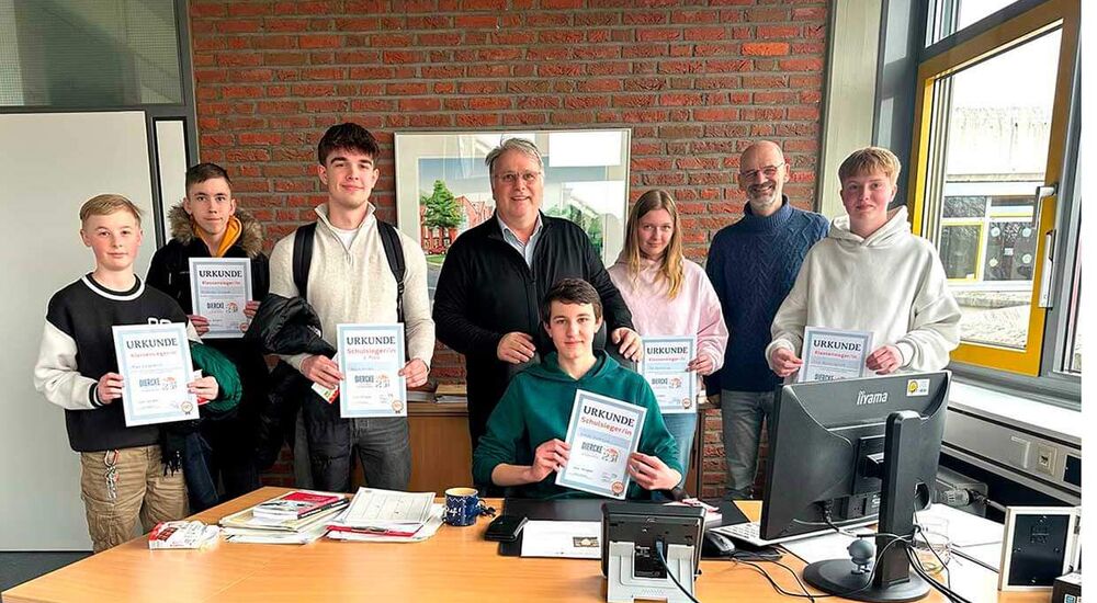 Von links nach rechts: Max Hagedorn (Klasse 7e), Alexander Erhardt (Klasse 9e), Kevin Herber (Klasse 10e), Schulleiter Ingo Krimphoff, Simon Hakenjos (Klasse 10b), Tea Spielbrink (Klasse 7d), NW-Lehrer Christoph Jokwitz und Finn Möcklinghoff (Klasse 10d)